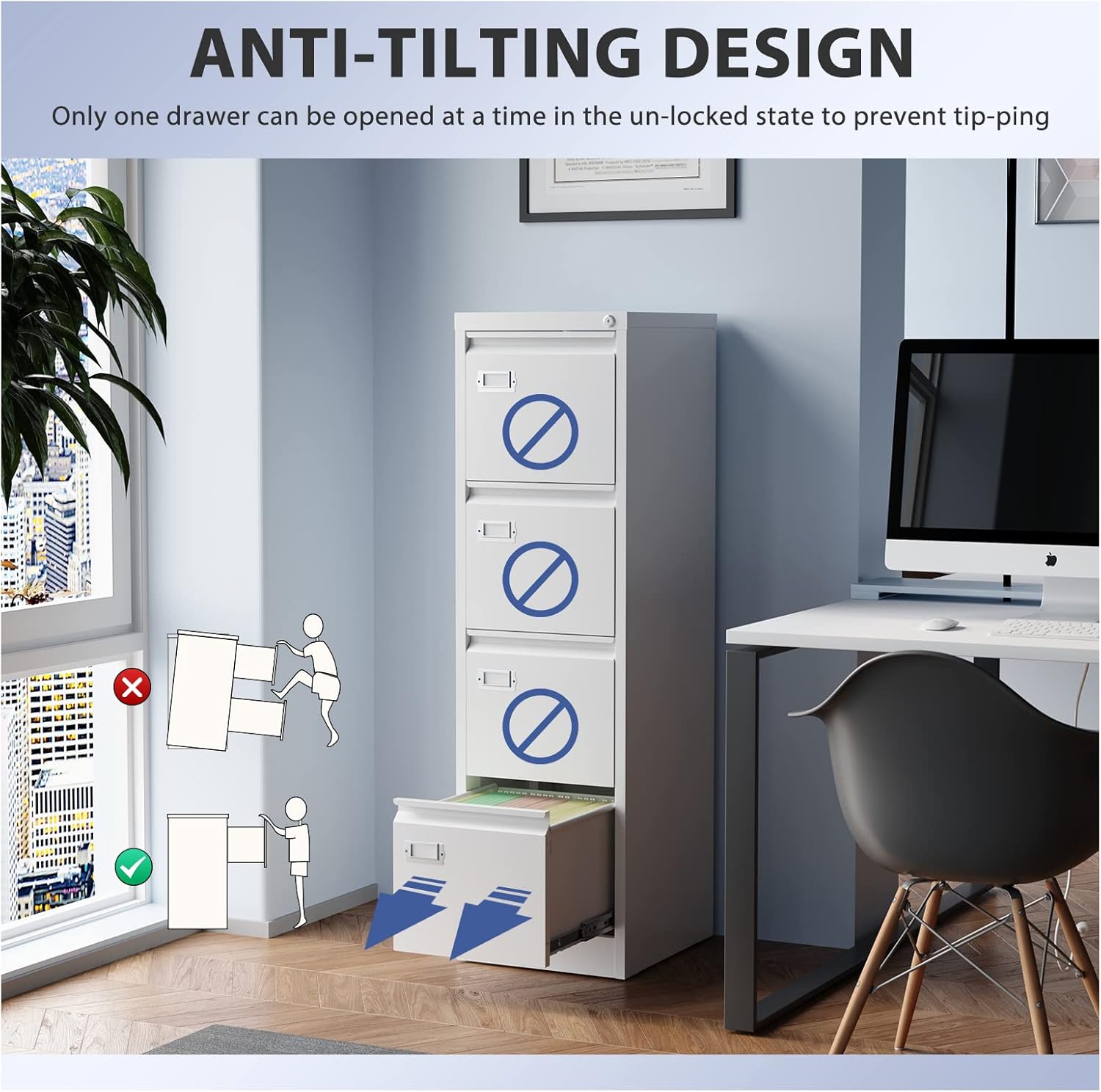 - ăAnti-Tilt DesignăThis office file cabinets has a lock that can lock all four drawers and comes with two keys. It helps you keep your valuables and documents safe. In the unlocked state, only one drawer can be pulled out at a time, preventing the movement of multiple drawers causing the overall center to shift and the box to fall.