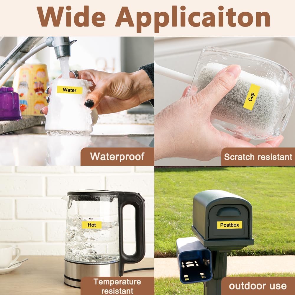 - Product features : Split back, water resistant, fading resistant, abrasion resistant, temperature resistant, strong adhesive. This compatibel 12mm tze-631 Black on Yellow label tape is suitable for indoor and outdoor use