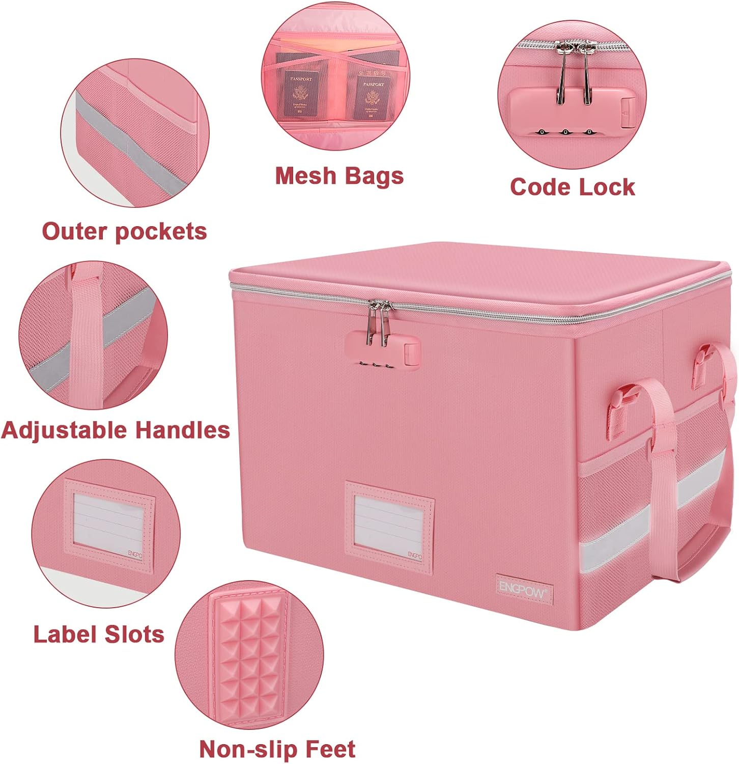 ENGPOW File Box with Lock, Fireproof Document Box with Pockets, Collapsible File Organizer Filing Storage Cabinet with Handle, Portable Home Office Safe for Hanging Letter/Legal Folders, Pink, 2 Pack