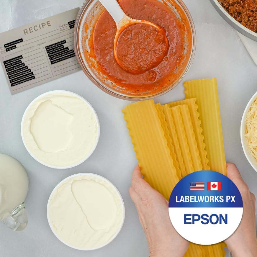 - DIMENSIONS AND COLOR - This Epson Labelworks Designer Collection tape is 3/4" (18mm) in width and 26 ft in length. The label maker tape is Matte Black and prints with White text. Works with Epson LABELWORKS PX printers and K-Sun printers, more listed below and in product description.