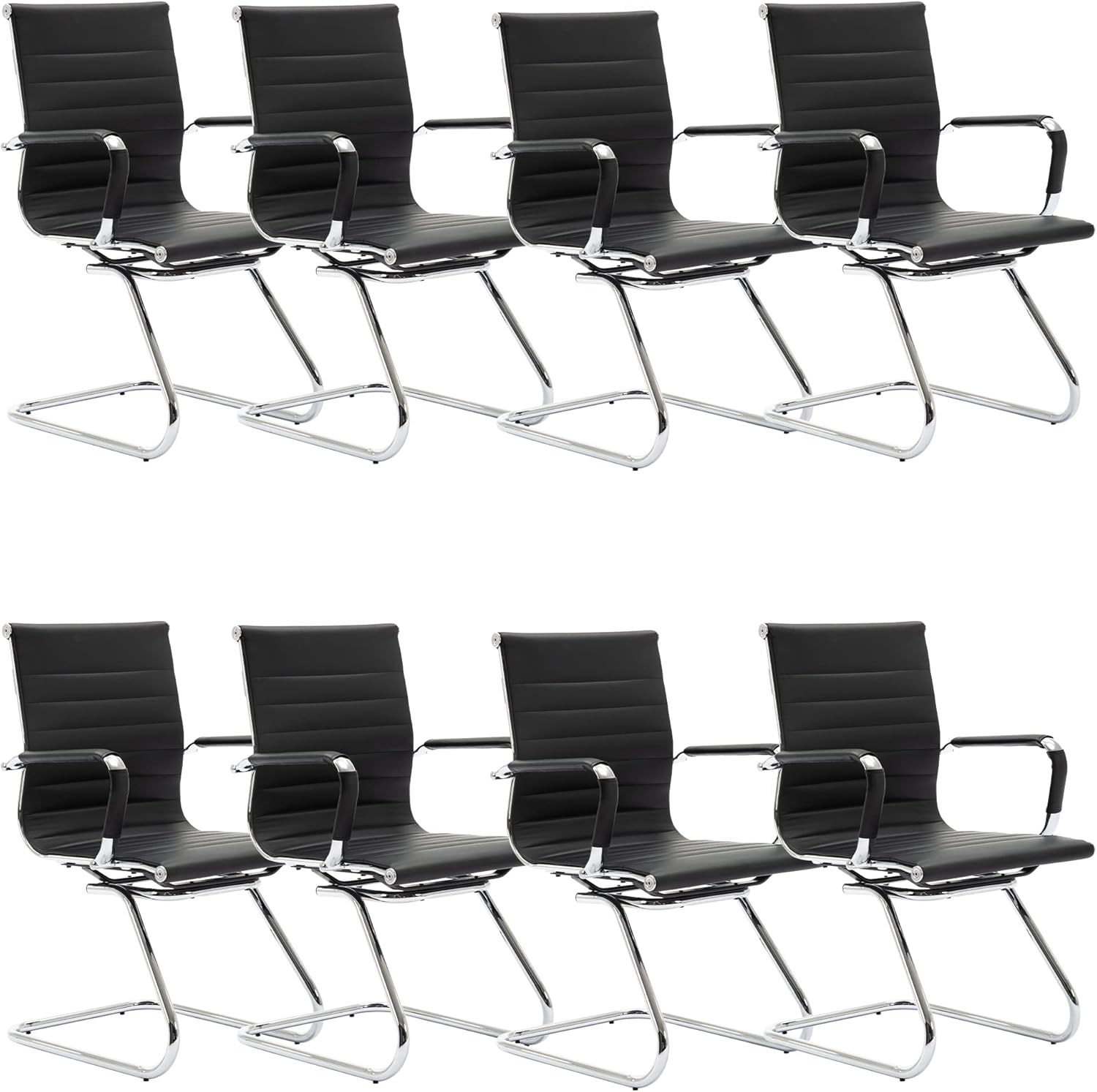 Black Office Desk Chair No Wheels Set of 8 PU Leather Computer Chairs Mid Back Guest Chairs for School Reception Conference Waiting Room, Black