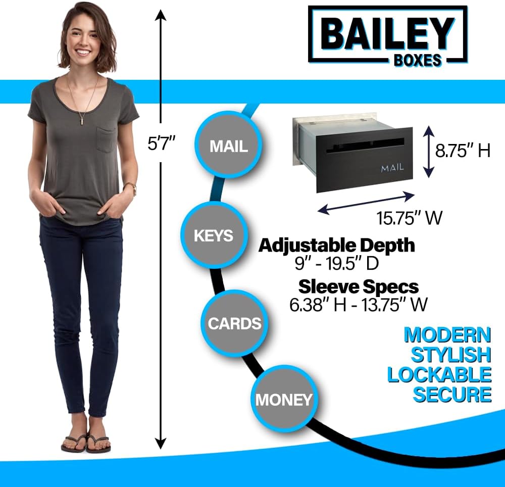 Brick-in Chute Through The Wall Stainless Steel Mailbox - Modern Architectural Locking Design - 8.75" H x 15.75" W - Enhance Your Home with The Melton from Bailey Boxes