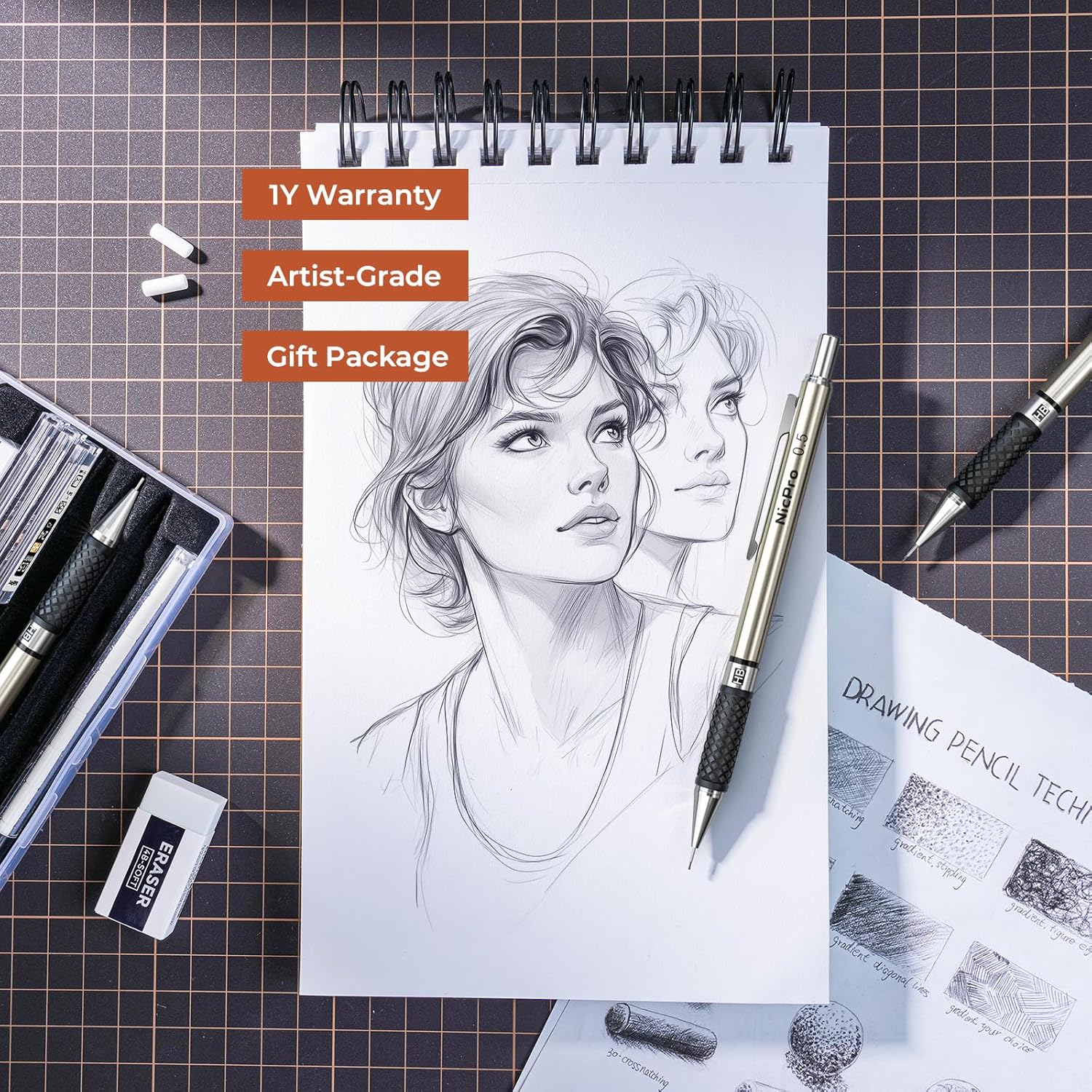 Nicpro RG1000 0.5 mm Art Mechanical Pencil Set in Storage Case, 3 PCS Metal Drafting Pencil Lead Pencil with 6 Tube HB Refills, 3 Erasers, 9 PCS Eraser Refills for Artist Writing, Drawing, Sketching