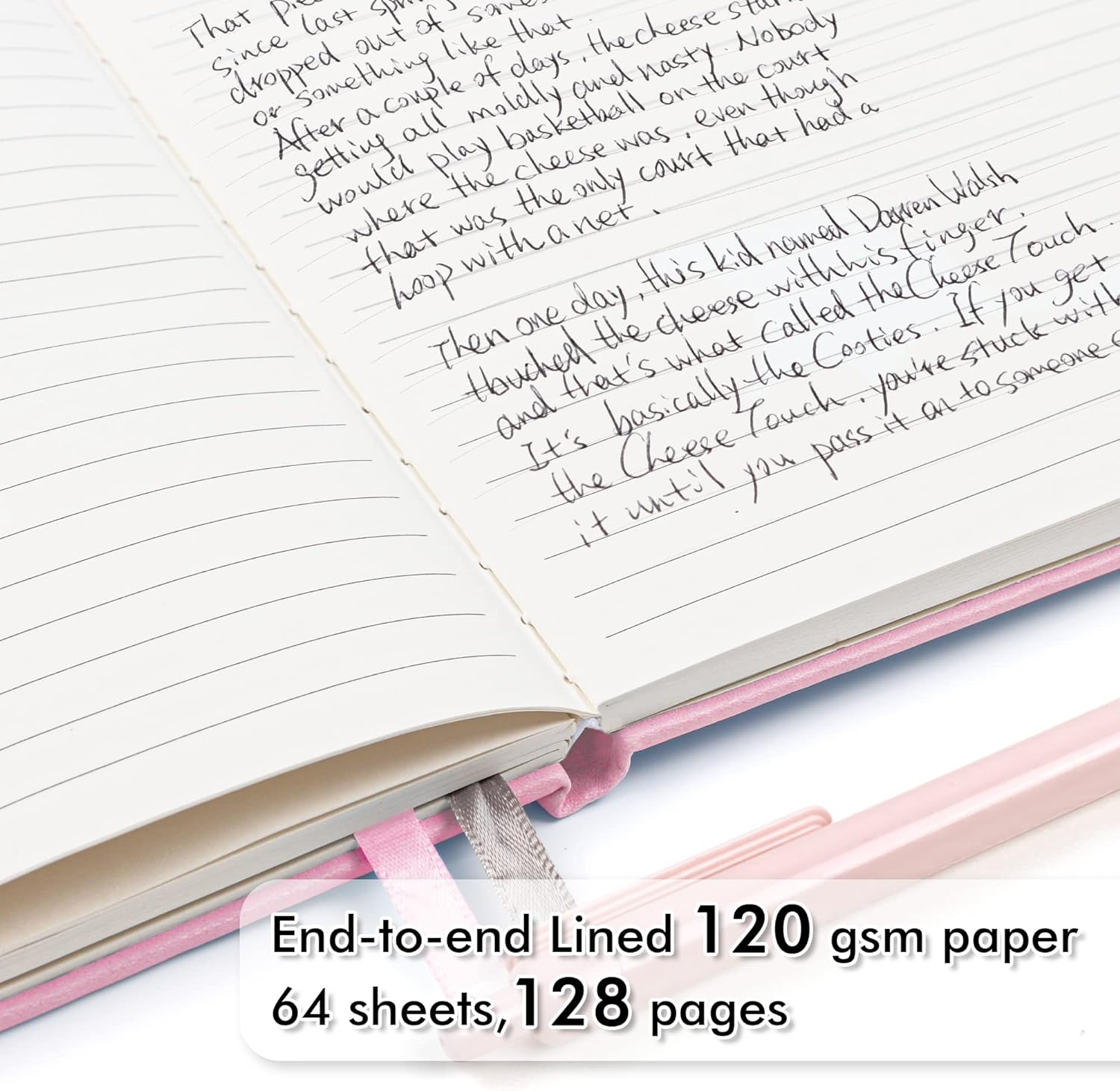 - These classic ruled notebooks are all blank inside with 128 lined pages (64 sheets), which would be convenient for daily usage. The hard cover journal has a water-resistant faux leather cover, round corners and bookmarks, which is designed to lay and open flat. There’s a “date/page” column on the top of every page. You can use it as a reminder to let you remember those important dates and find the page you want in a very short time.