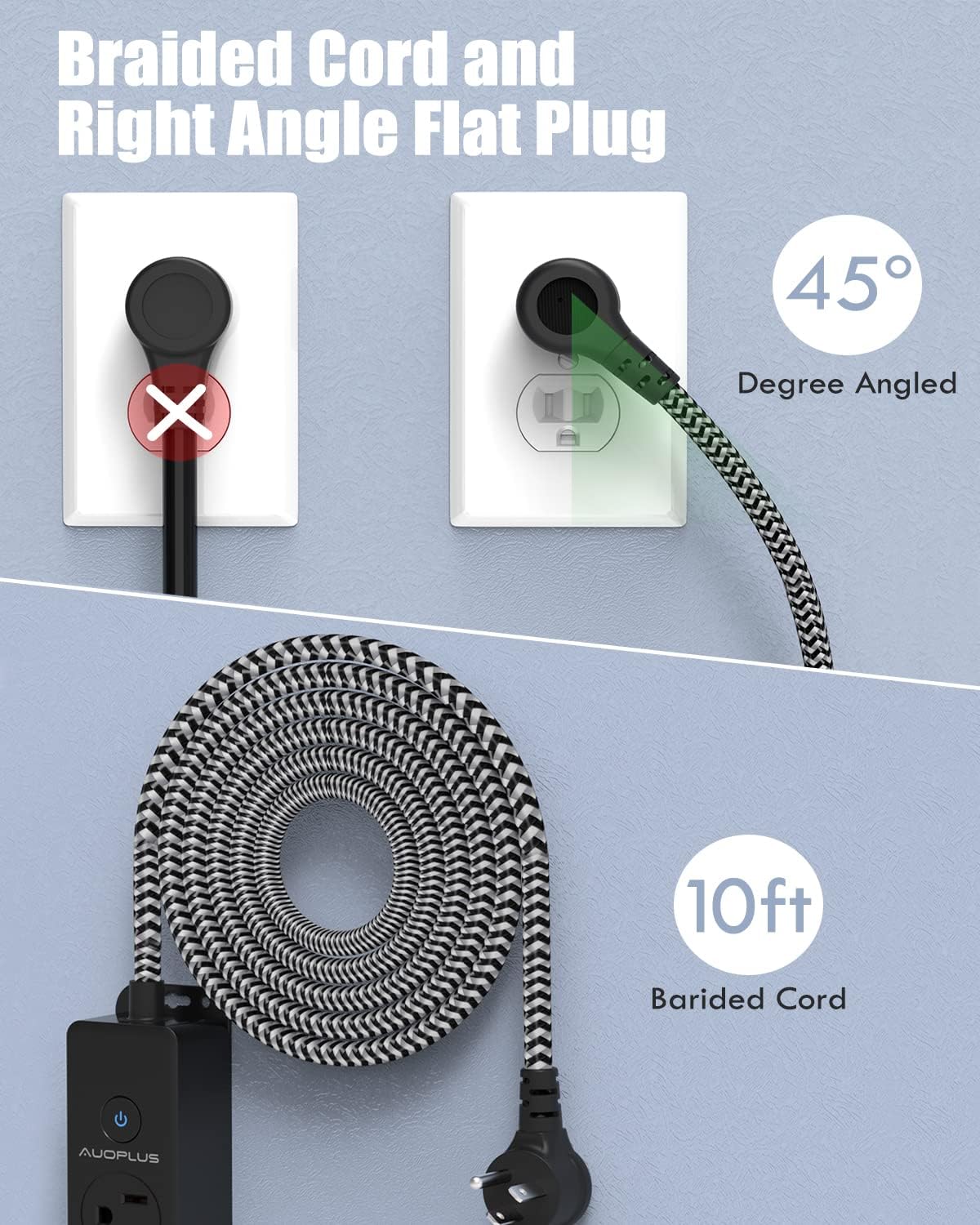 - 10FT Power Cord & Flat Plug: Equipped with a right-angle flat plug for fitting in tight spaces, perfect for your nightstand. With a 10ft power strip long cord, it's perfect for home, office, or dorm. The braided power cord is not easy to deform, is durable, and is safer than other power cords.