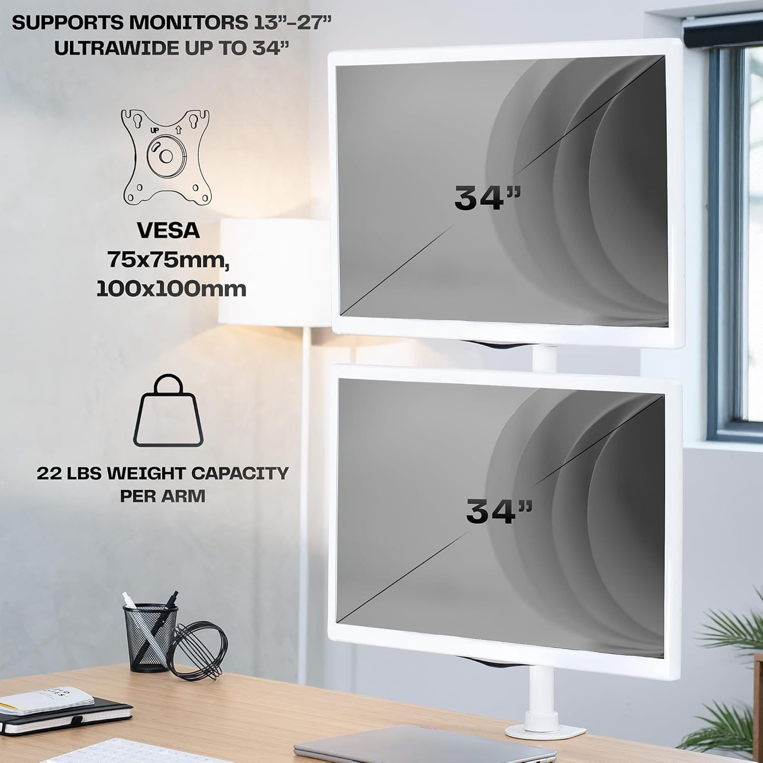 - Ultrawide Compatibility: Dual vertically stacked monitor mount fitting two ultra-wide screens 13” to 34” in size and up to 22 lbs in weight (each) with VESA 75x75mm or 100x100mm mounting holes