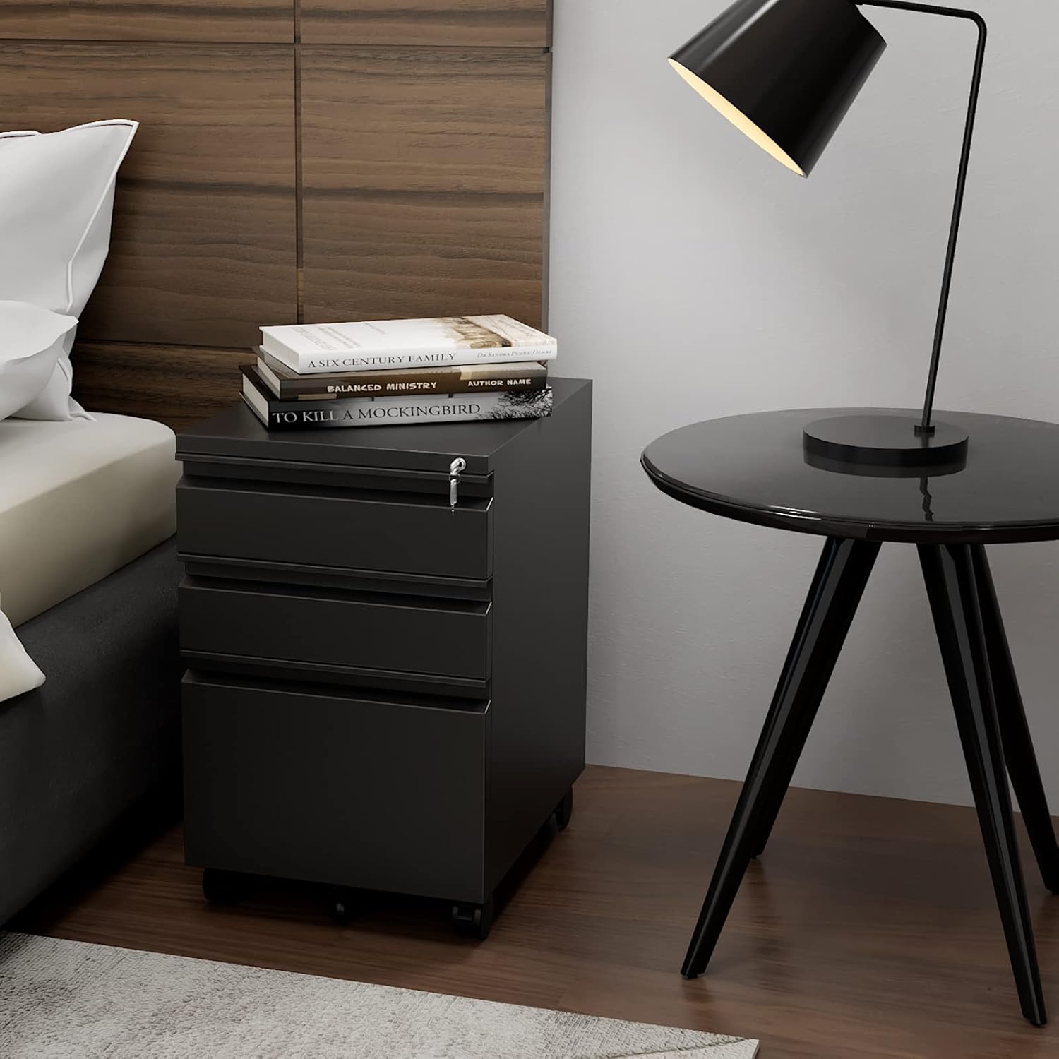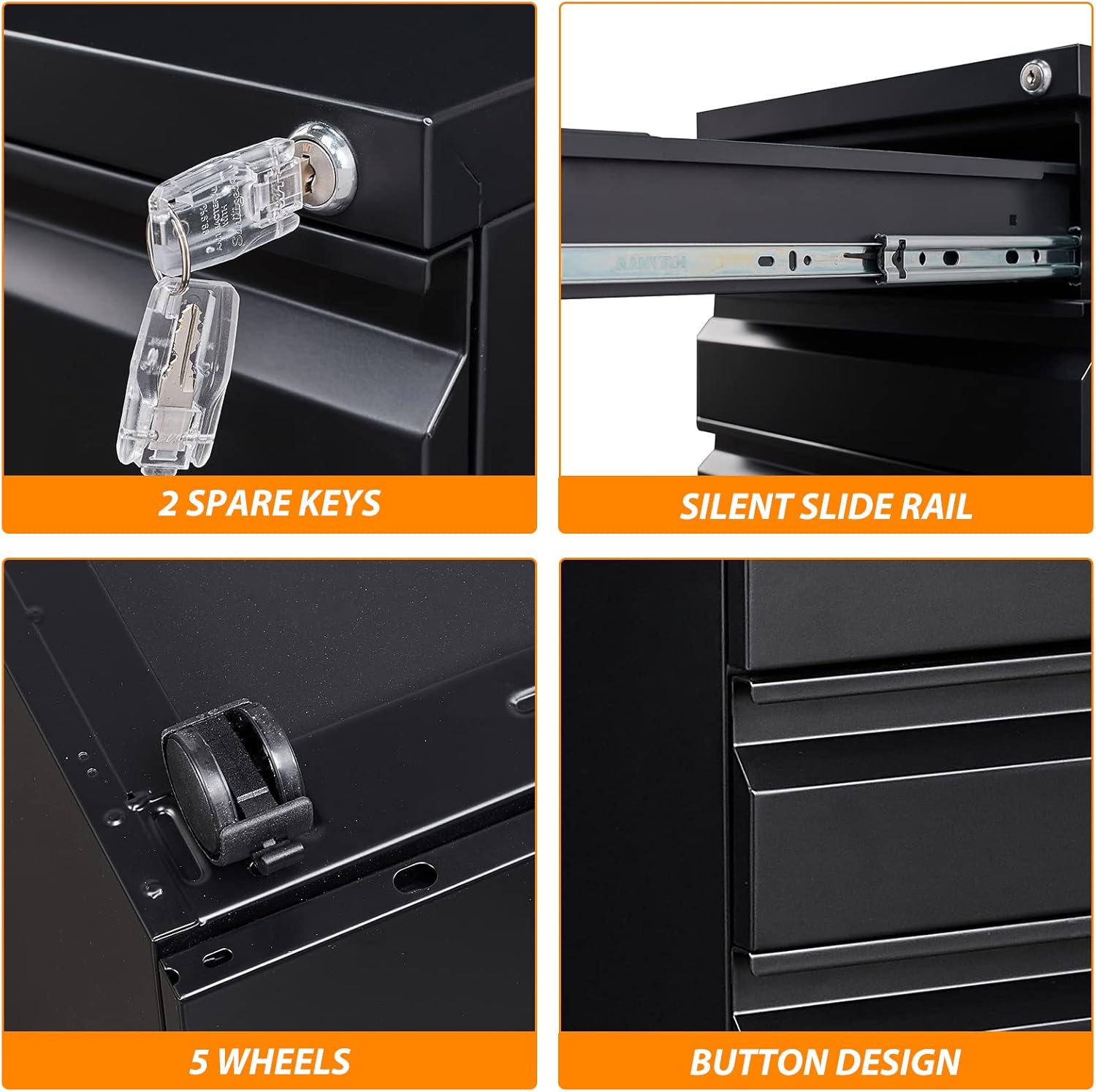 - ăMobile File Cabinetă: Equipped with 2 lockable casters + 2 360° swivel casters + 1 anti-tilt wheel, you can easily and safely move it. The 360° swivel casters make it easy to turn in any direction, while the lockable casters provide braking and the center support wheels prevent tipping, allowing you to place the cabinet stably under a table or elsewhere.