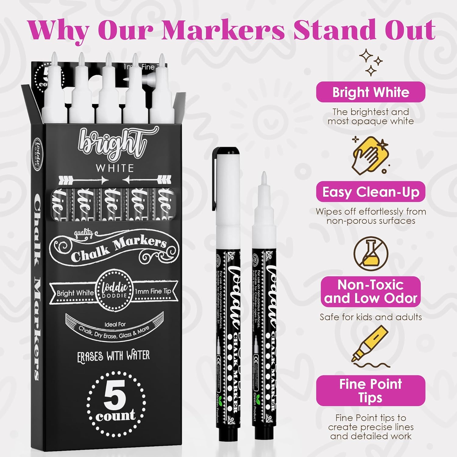 Loddie Doddie Fine Liquid Chalk Markers for Chalkboard - 5 Count Erasable Low-Odor White Chalkboard Markers with Fine Tip - White Chalk Pens - Erasable Pens