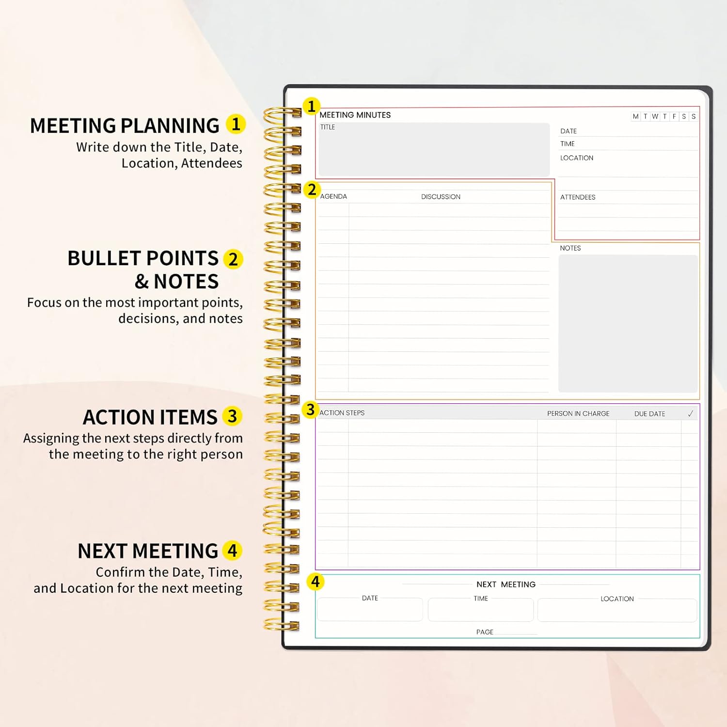 - Better Tool Drives Better Meetings: The hassle of organizing the chaotic meeting notes VS this professional meeting notebook. Definitely a step up! Everything is neatly zoned on each page makes it a breeze to fill them out and ensure all you need are accounted for. Each meeting journal comes in exclusive protective packaging and accompanying by our client service commitment to your utmost satisfaction.