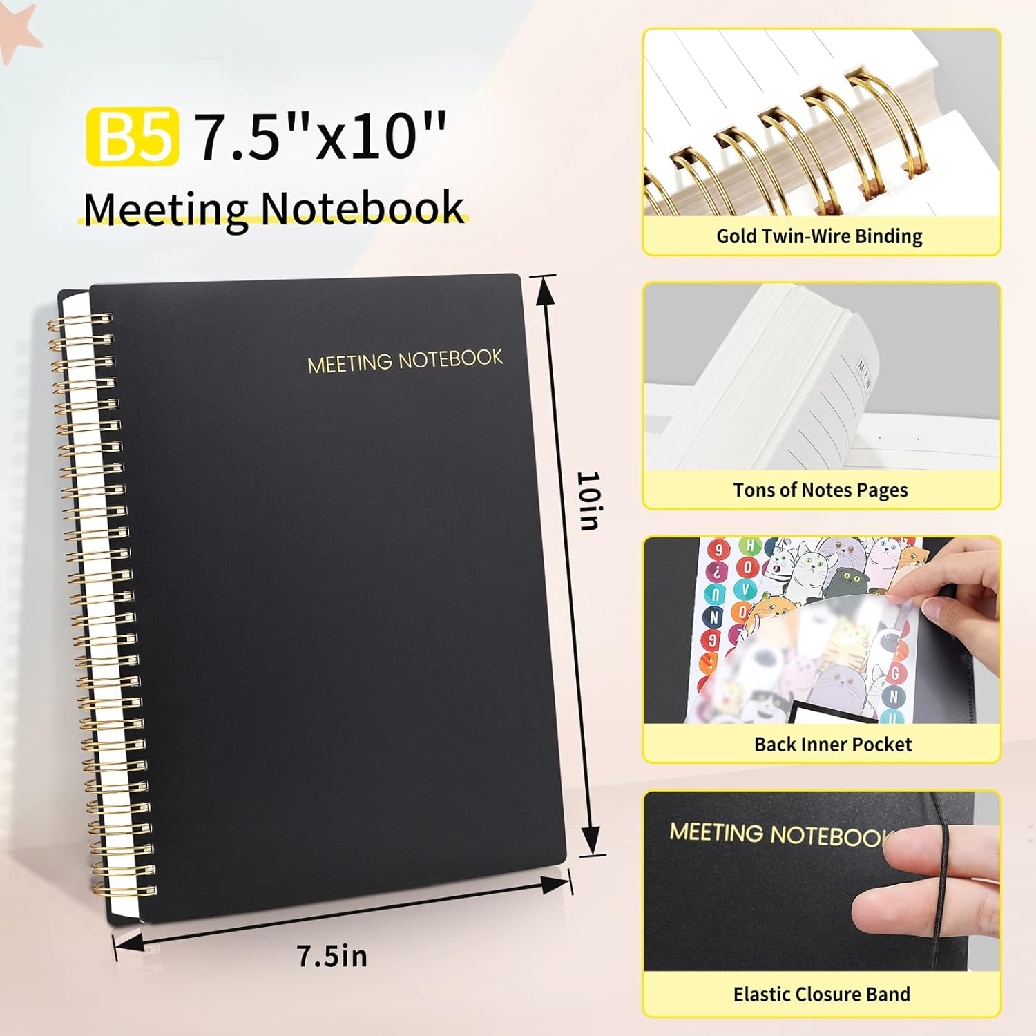 SUNEE Meeting Notebook for Work with Sticky Tabs - 160 Pages, B5 Size Project Planner, Spiral Meeting Agenda/Minutes Notebook Organizer for Women Men, Note Taking, Office & Business, 7"x10", Black