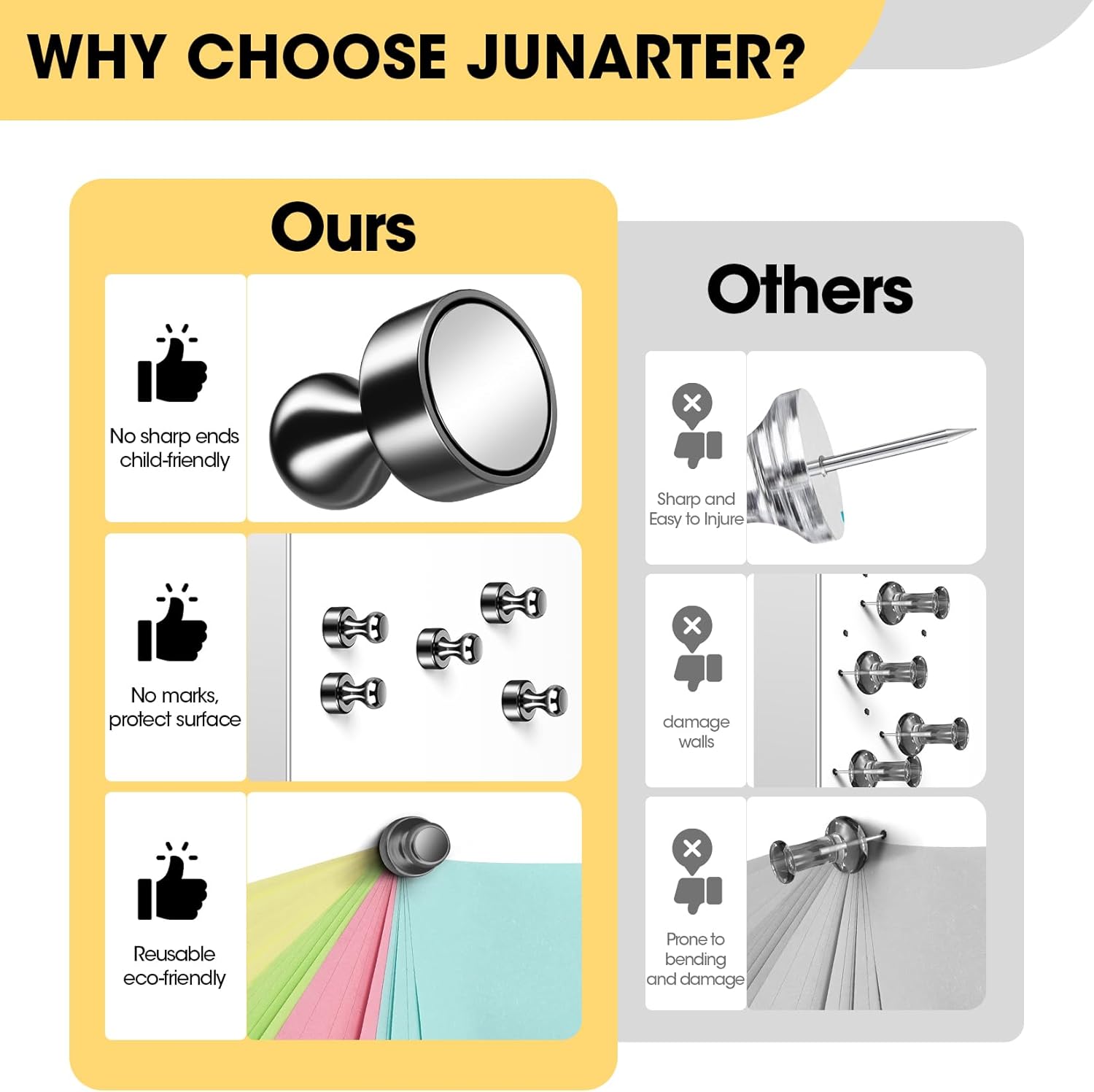 - 🛒WIDELY USED: The push pin magnets are used to hang the recipes and pictures on the refrigerator and assist your display in reporting to your leader in the office. Apart from these scenes, you can use these strong whiteboard magnets wherever you need to hang something. What it deserves to mention is that it is easy to use and leaves no scratch on the surface.