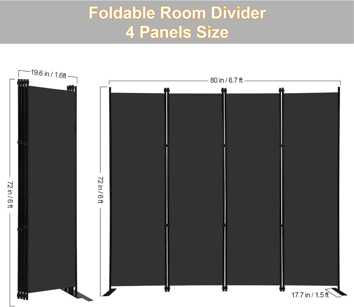 - 【CREATE A PRIVACY SPACE】- This screen room divider can section off space into separate areas as a temporary wall. Max expanded size is 80"W X 17.7"D x 72"H. Regular use width is 60"~70" depending on the angles kept.