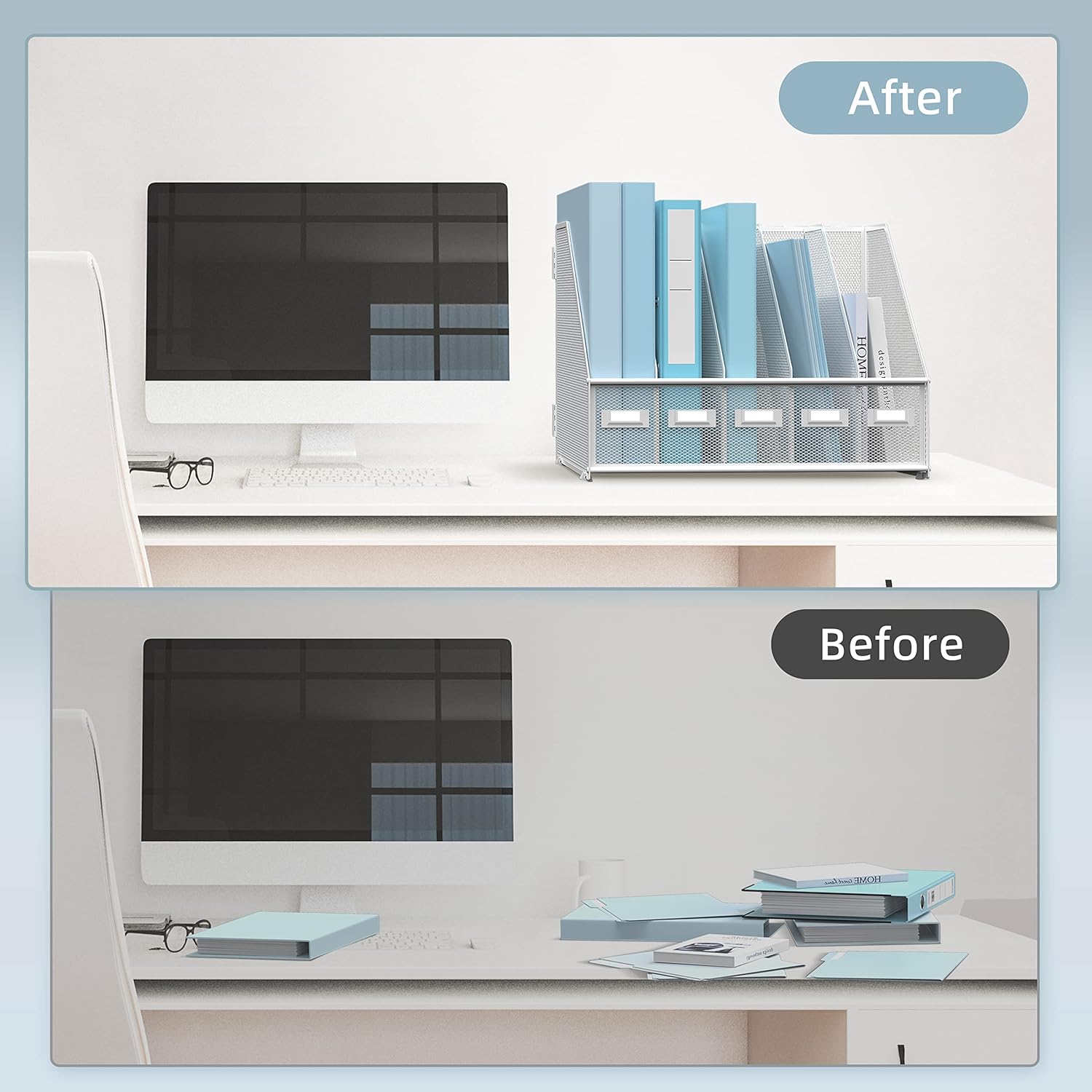 - [Desktop Organizer with Labels] Each compartment of our office organizer for desk comes with a front-facing label bar, making it easy for you to write, categorize, and clearly identify the contents of each section at a glance.