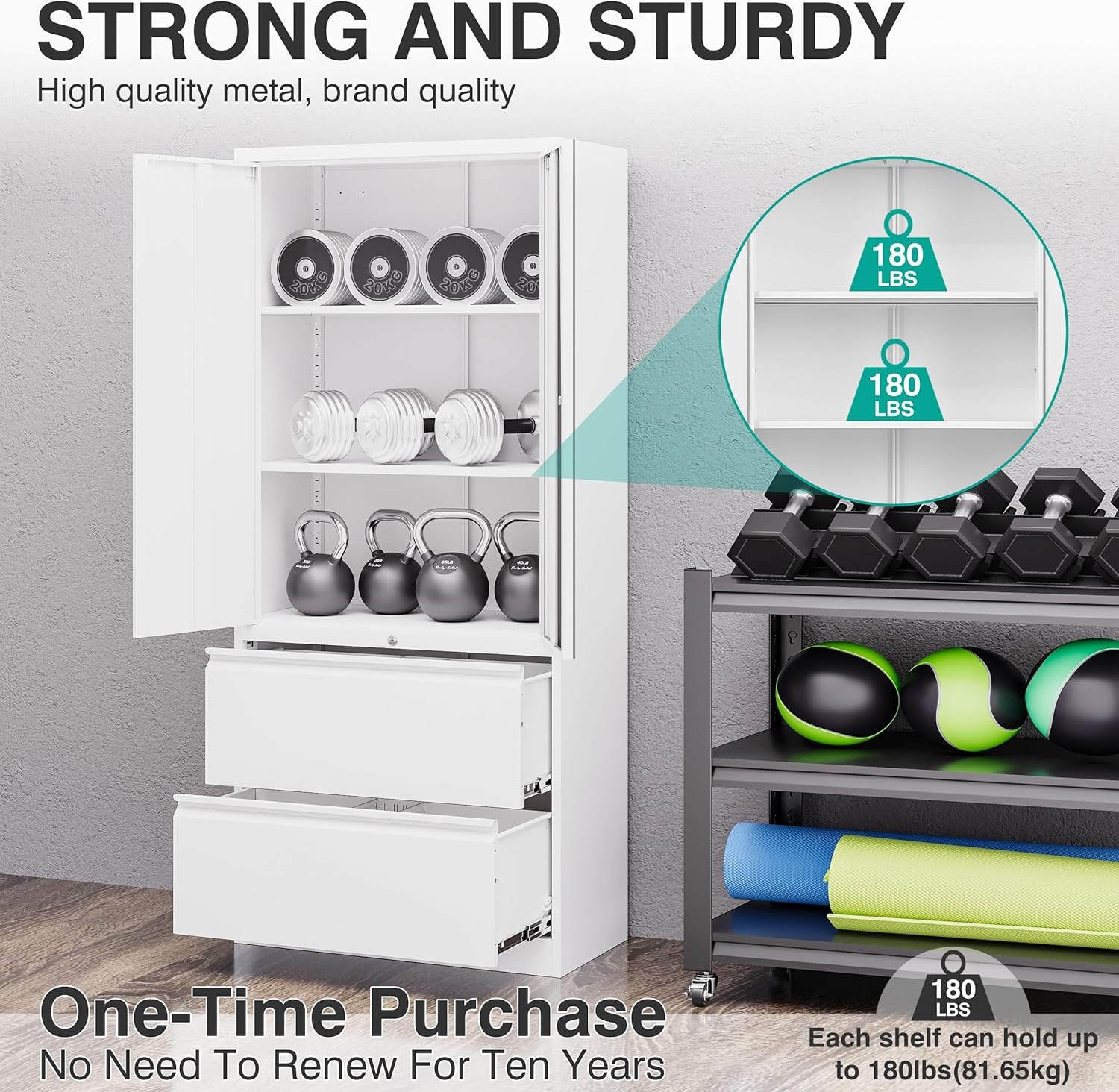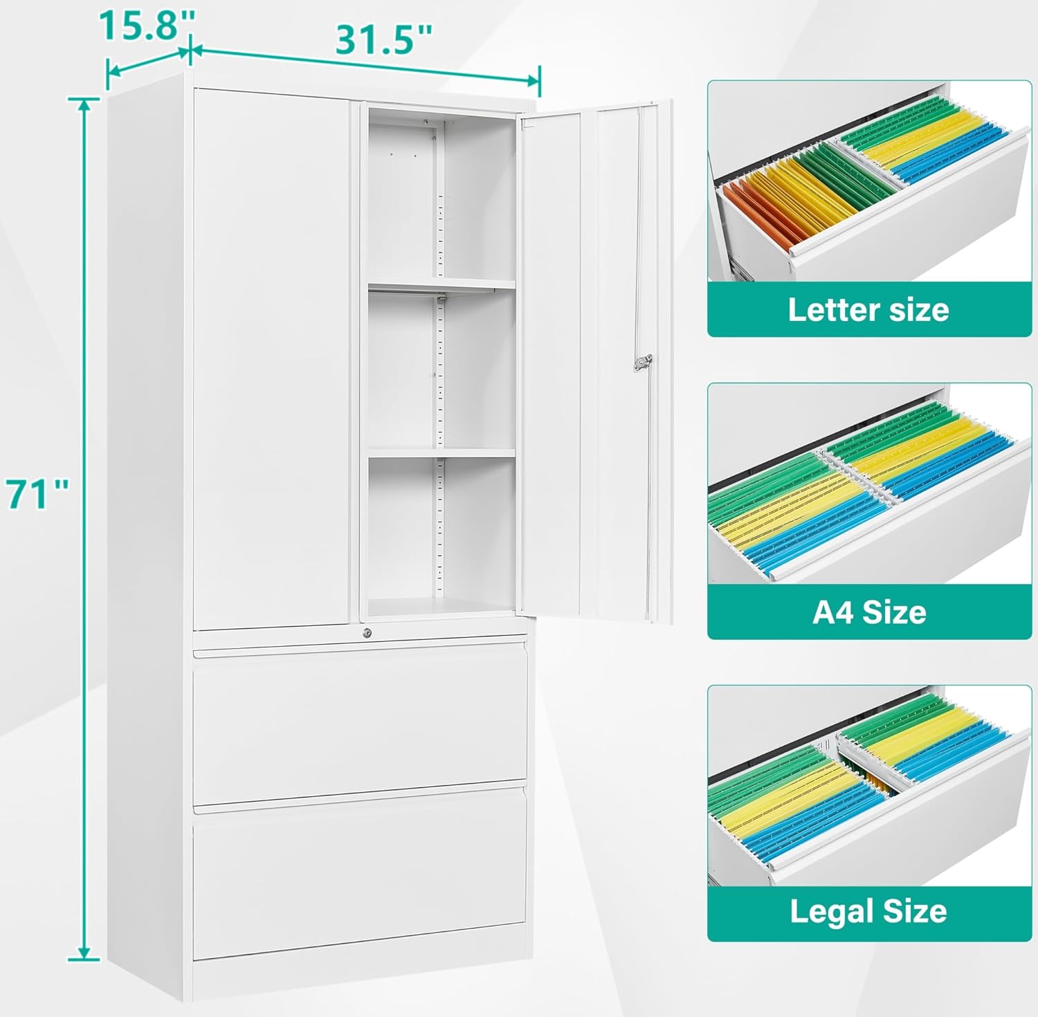 SISESOL 2 Drawer Lateral File Cabinet with Lock and Shelf,71" White Filing Storage Cabinet with Doors,Locking Metal Storage Cabinets with Drawers for Home,Office,Garage,School,Fit A4/Letter/Legal File