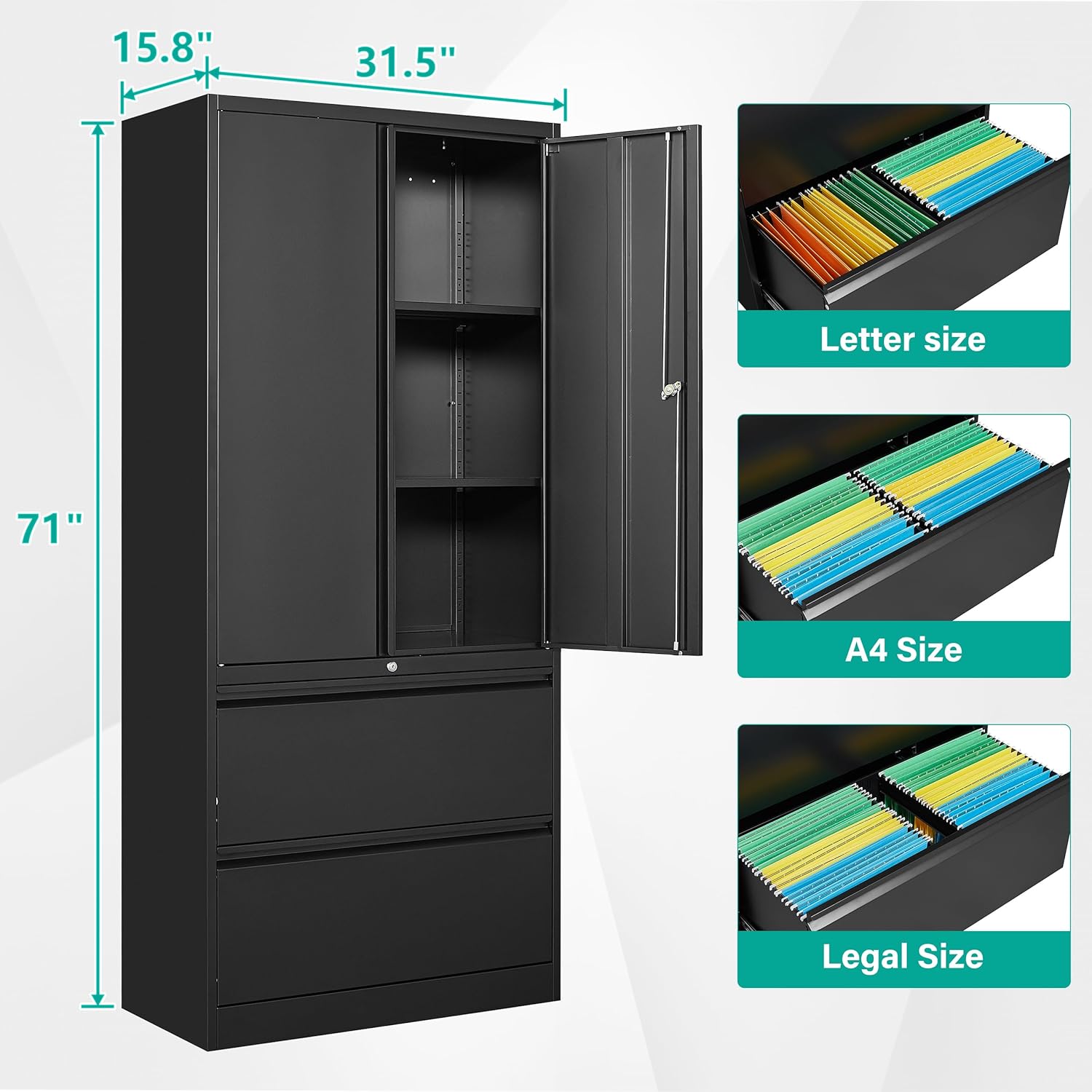 SISESOL 2 Drawer Lateral File Cabinet with Lock and Shelf,71" Black Filing Storage Cabinet with Doors,Locking Metal Storage Cabinets with Drawers for Home,Office,Garage,School,Fit A4/Letter/Legal File