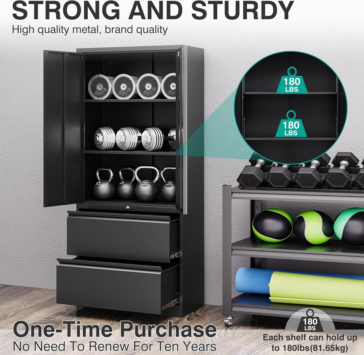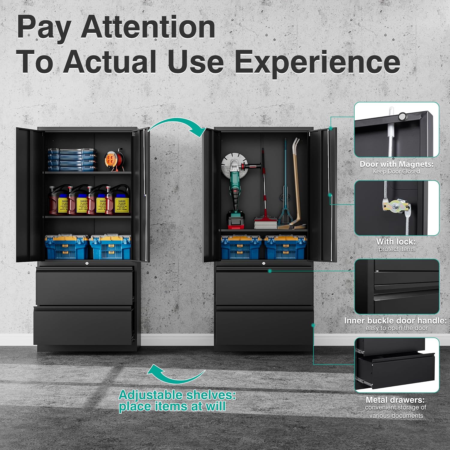 - 【Tall & Wide & Deep-Large Capacity】: Large metal storage cabinet with 2 adjustable shelf to meet your different needs for placing items, shelf and door lock can highly protect items from temperature, dirt and dust