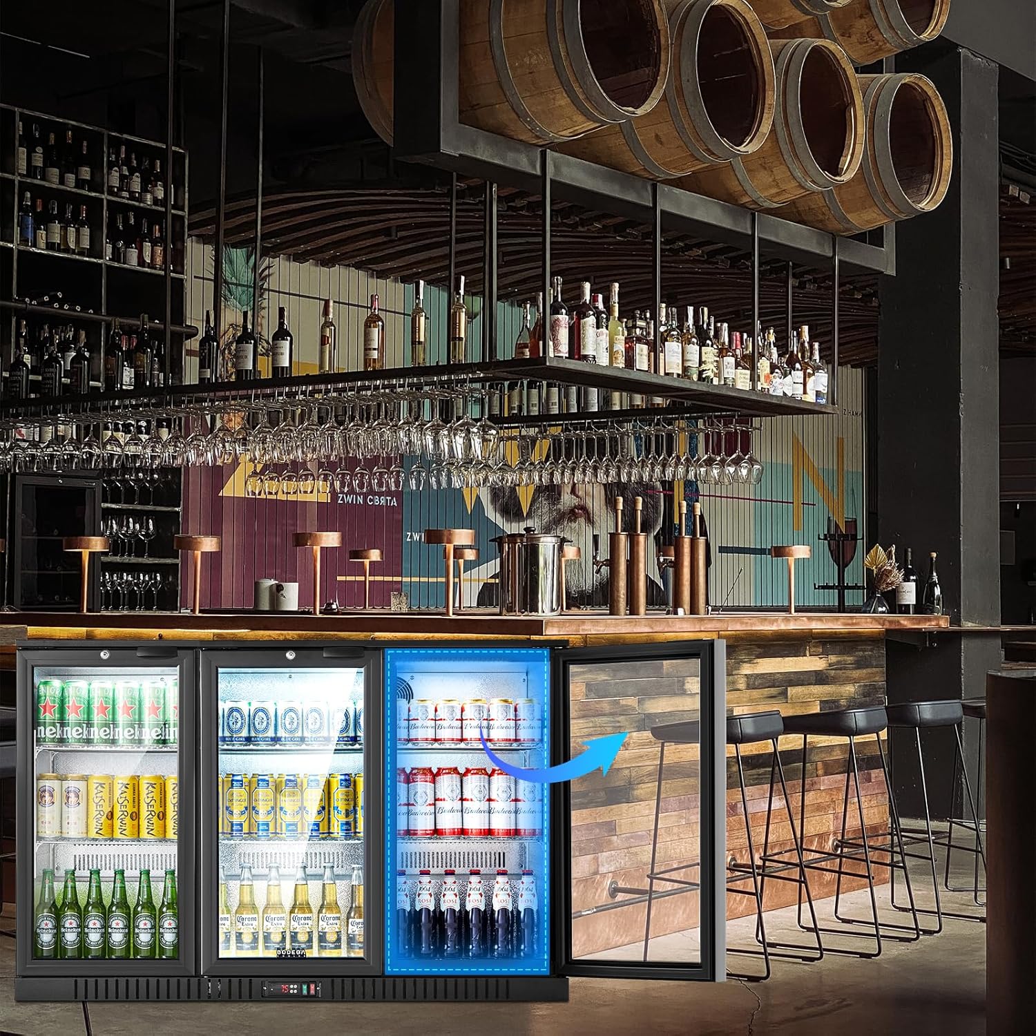 - COST-EFFECTIVE BAR REFRIGERATOR COOLING SOON-The built-in high-powered refrigeration system combines optimal air circulation with an efficient condenser fan motor,ensures that the beverage optimal temperature.Digital temperature display and controls make it convenient to monitor and adjust the temperature,always keep your customers happy with cool beers and drinks.This 3 glass door bar fridge with 4 adjustable feet bottom to support and avoiding leaking or dust.
