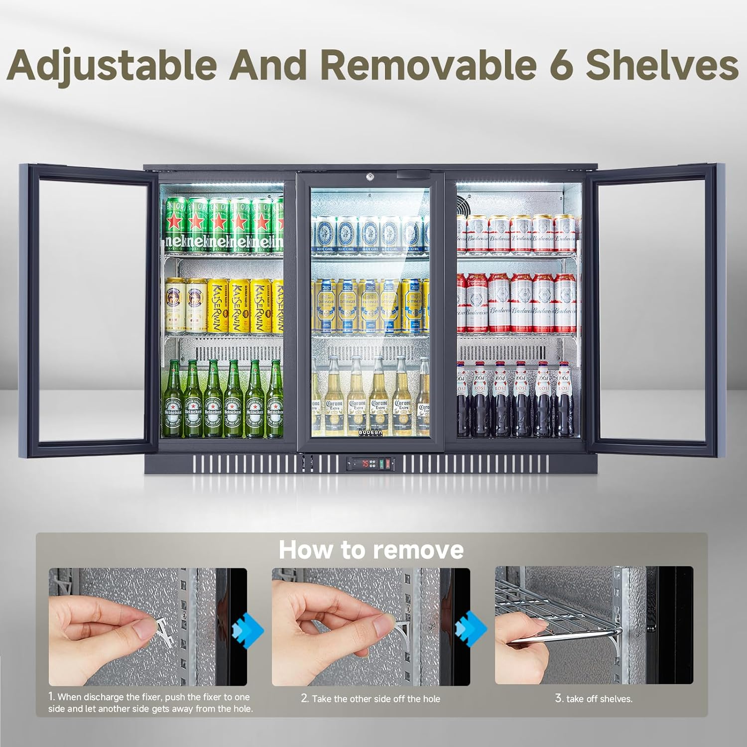 - DIGITAL CONTROL UNDER COUNTER REFRIGERATOR-This commercial counter height refrigerator with electric temperature control,switch is on the bottom.It features an easy-to-read LED display.Back bar cooler inside with 6 sturdy adjustable shelves hold up to 328 cans or 100 bottles,you can change the rows to accommodate different size of beer cans or wine bottle.Plenty of spaces as back bar beverage cooler.Each zone with single lock to protect drinks.Door knob is on the top, easy to open.