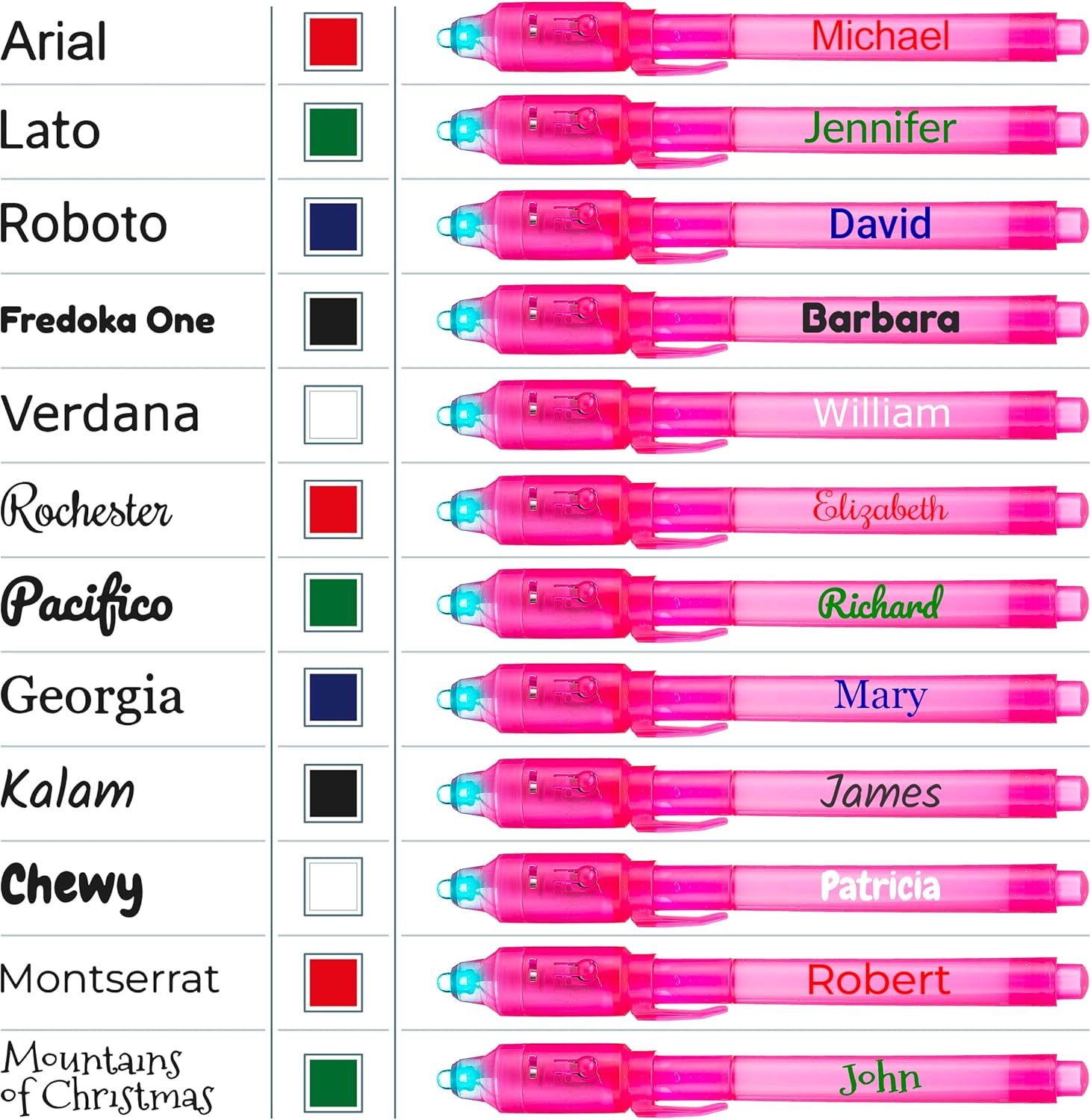 - GREAT GIFT FOR FUN PARTY FAVORS: These Personalized Invisible Spy Pens come in a pack of 12 Pink Pens to make the activity more exciting and fun.The color of the light is blue and it will display the words written in clear ink for all pens. Batteries are included and installed. Parents can buy these Spy Pens for their kid’s party at home. Schools, Teachers can buy it for students for a school Activity. Add it for any surprise gift bag or as Stock Stuffers.