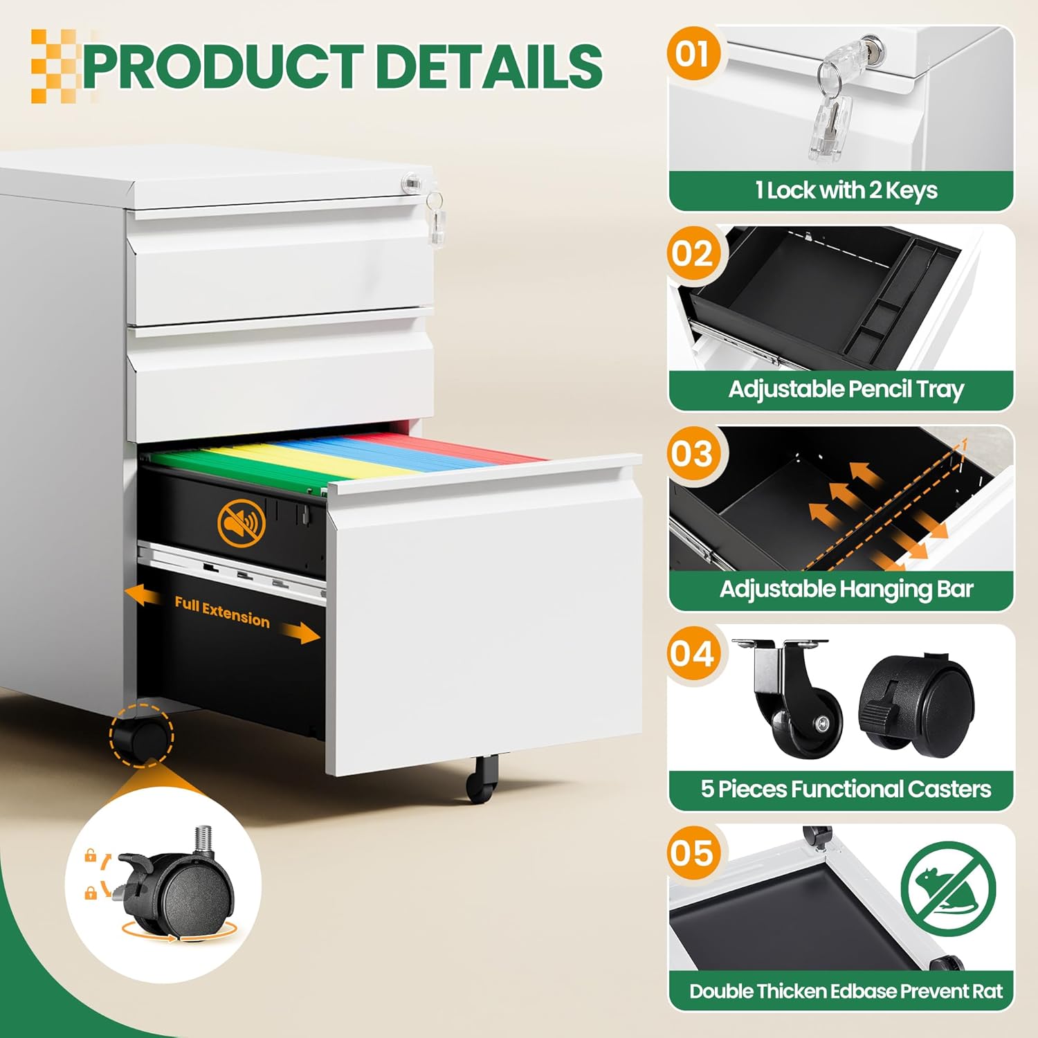 3 Drawer Mobile File Cabinet with Lock,Under Desk Storage Cabinet for Home Office,Vertical Filing Cabinet Fits A4 or Letter Size(Unassembled,White)