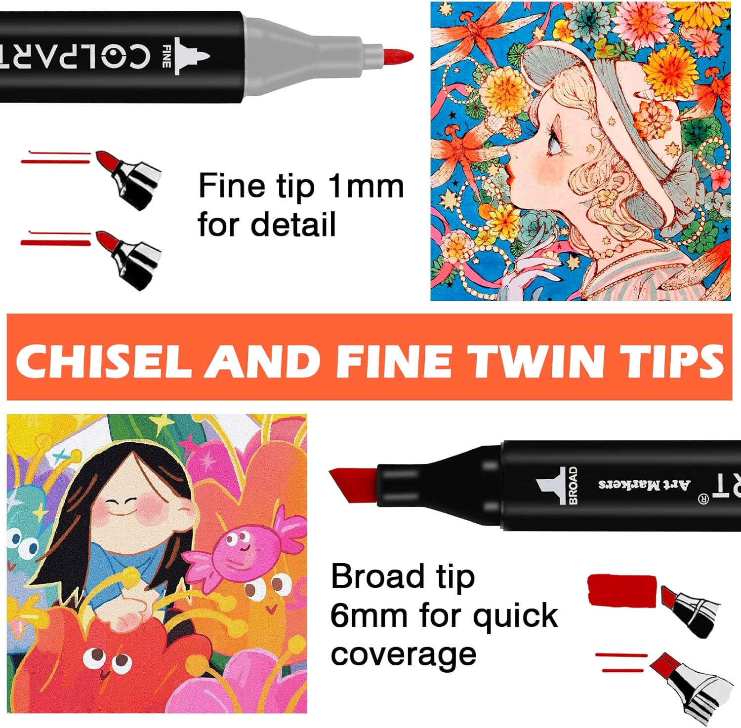 - 【Dual Tips Art Markers】Dual tips art markers design allows you to make thick and thin lines without changing alcohol markers.Includes Fine tip 1mm and Broad tip 6mm two tips for precise highlighting, sketching and underlining. Thin markers can be used to write and hook line while thick art markers professional are suitable for drawing and coloring.