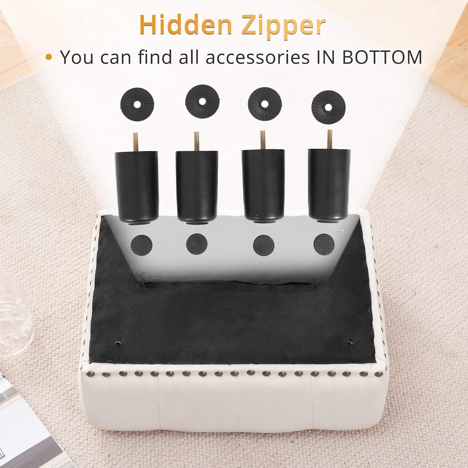 - ăHDDEN ZIPPERăThe footstools ottoman has hidden zipper on bottom and you can find all accessories you need on bottomn. After Assemble it, it can be a small storage space for you and your kids to hide small stuffs, such as small toy, candy and receipt.