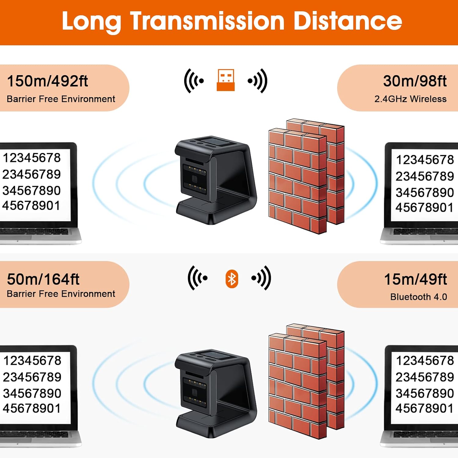 - 2.4G Wireless & Wired :Wired barcode scanner can directly place on the desk, no need to hold the scanner, release your hands, improving your efficiency. If you need to work on the move, 2.4G Wireless barcode scanner can follow you around and get the job done. Barrier-free environment 100Feet ,Barrier environments 50Feet .