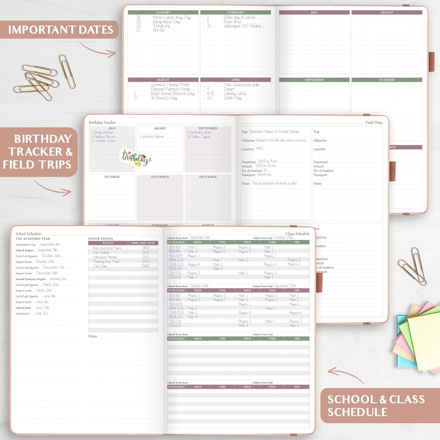 - STORE ALL HELPFUL INFORMATION IN ONE PLACE – At the front of the school year planner, you will find sections for important dates, birthdays, field trips, teaching goals, professional development events, passwords, student contacts and health information.
