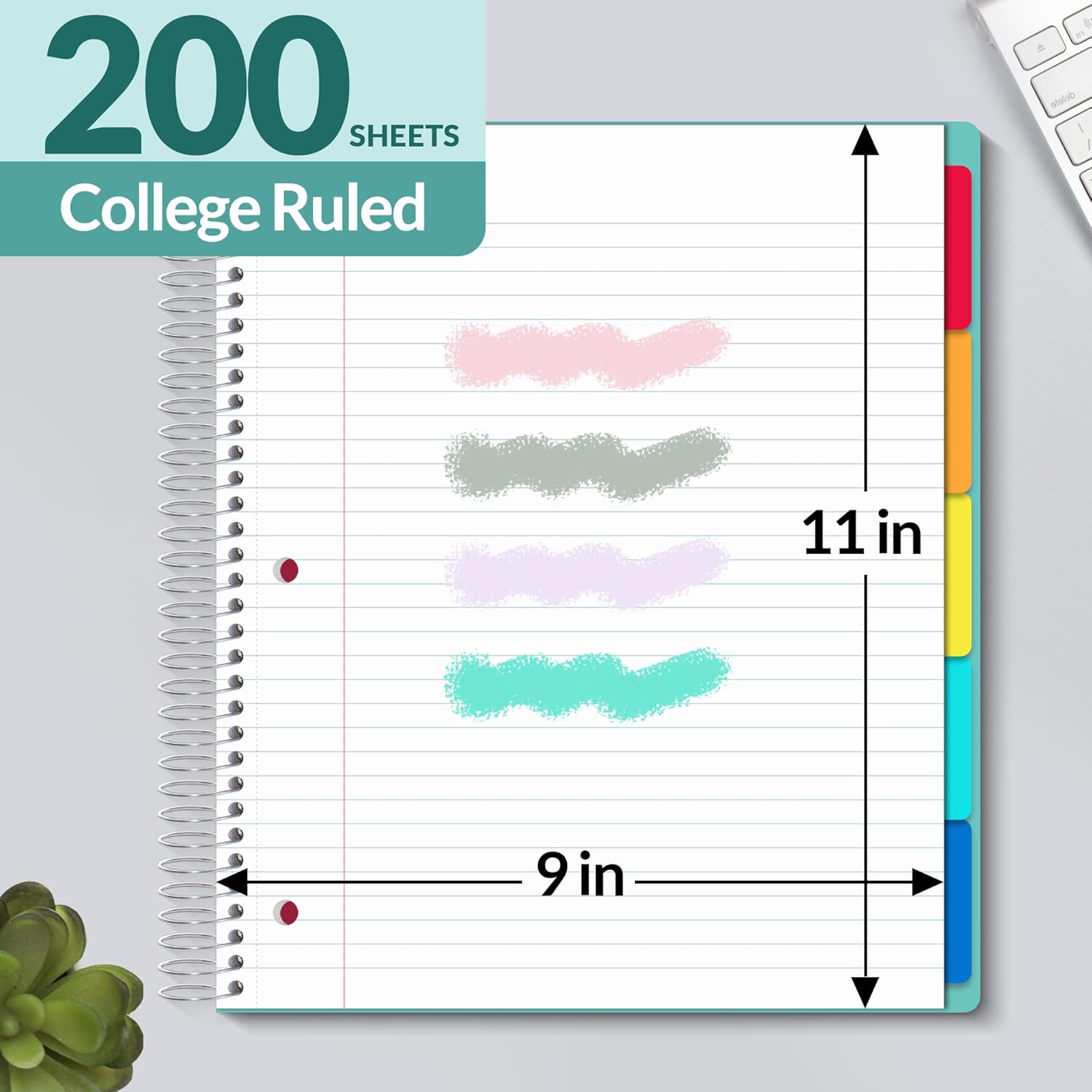 SUNEE 5 Subject Notebook College Ruled - 400 Pages, 9"x11", 5 Pocket Colored Dividers, 3-Hole Punched Paper, Teal