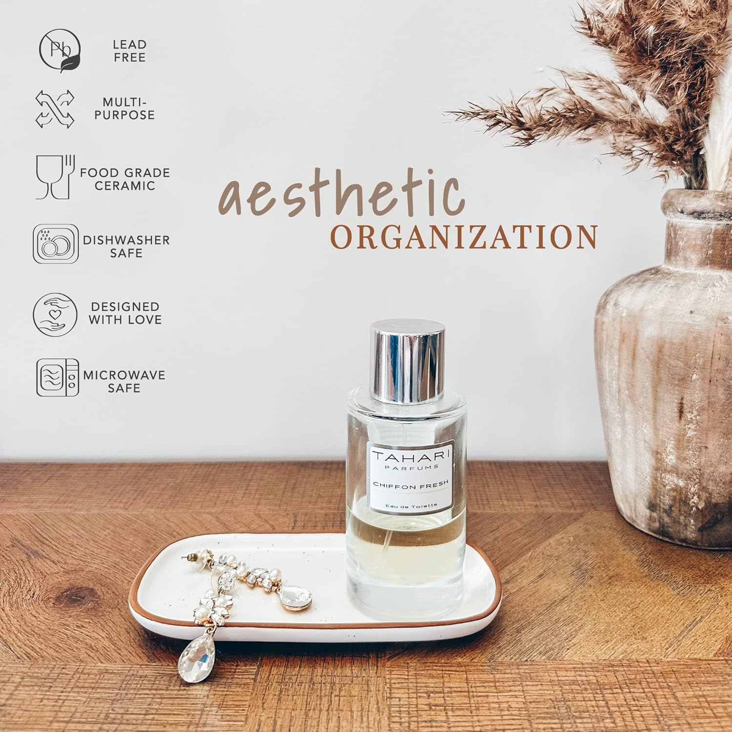- VERSATILE USES: We all love a multi-functional object. Trays are all the rage right now and with good reason. Storing things on a tray gives a minimal and organized aesthetic and can be used for an endless amount of things. Your stationary, soap dispensers, brushes, candles, cosmetics, jewelry etc all deserve a beautiful home. The glaze is also food grade and work great for serving cheese, sushi, mini cakes, etc.