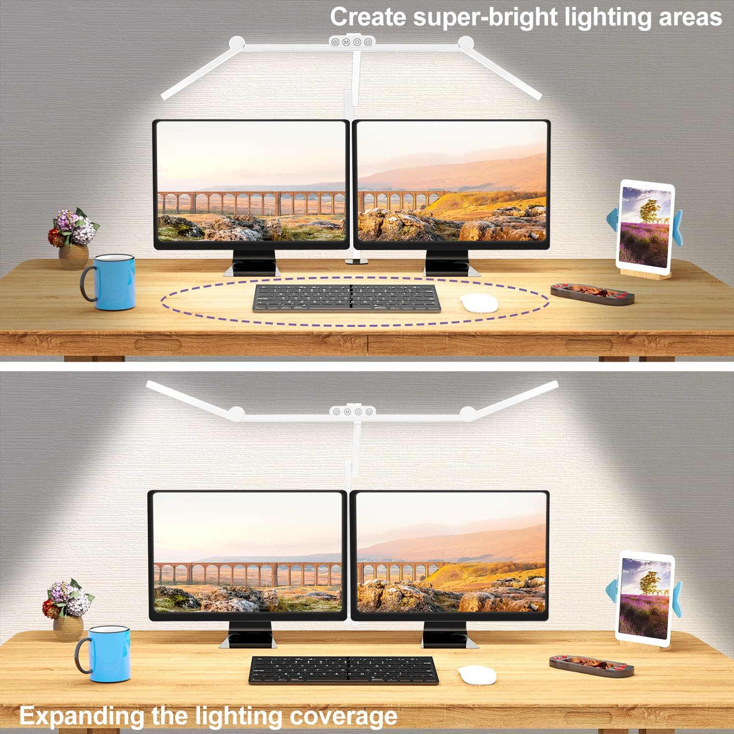 - 【7 Rotatable Joints】: Micomlan swing arms led desk light features 7 strongly damped joints with 3 ultra bright light bars design for freely vertical adjustment and horizontal adjustment. You can rotate the bilateral light bars vertically to change the illumination angle. Turn them up to expand the lighting coverage to illuminates your entire desk or turn them down to create a super bright lighting area for sewing crafting. You can also rotate the base to adjust the light direction and position.