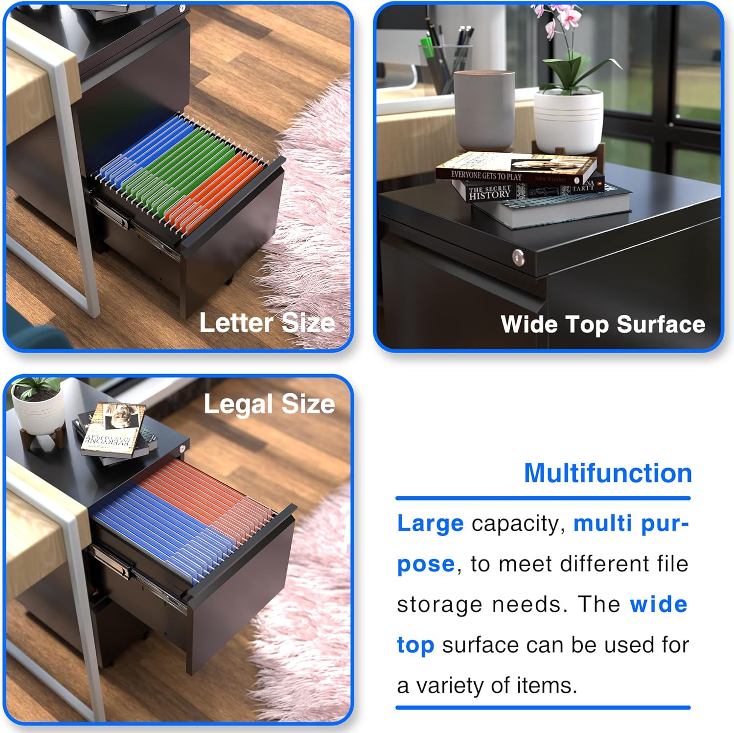 METAN 2 Drawer Vertical File Cabinet with Lock, Mobile Metal Filing Cabinet for Legal/Letter Size, Office Storage File Cabinet Under Desk, Fully Assembled Except Wheels, Black