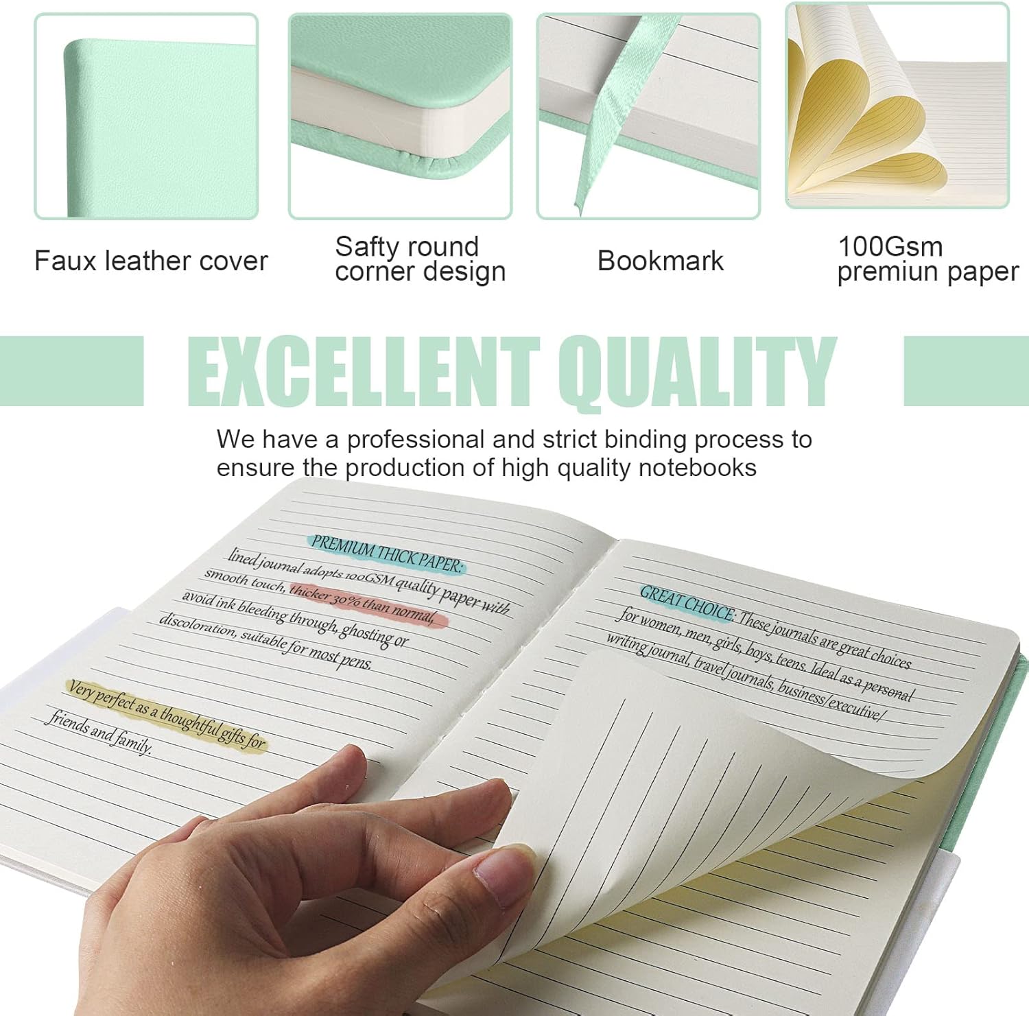 - Size & Package:5.7 in by 8 in Lined Journal Notebooks features durable and water-resistant vegan leather cover, can protect the pages inside for years and provide a comfortable writing surface.rounded corners, 160 pages, ribbon bookmark & elastic closure band.