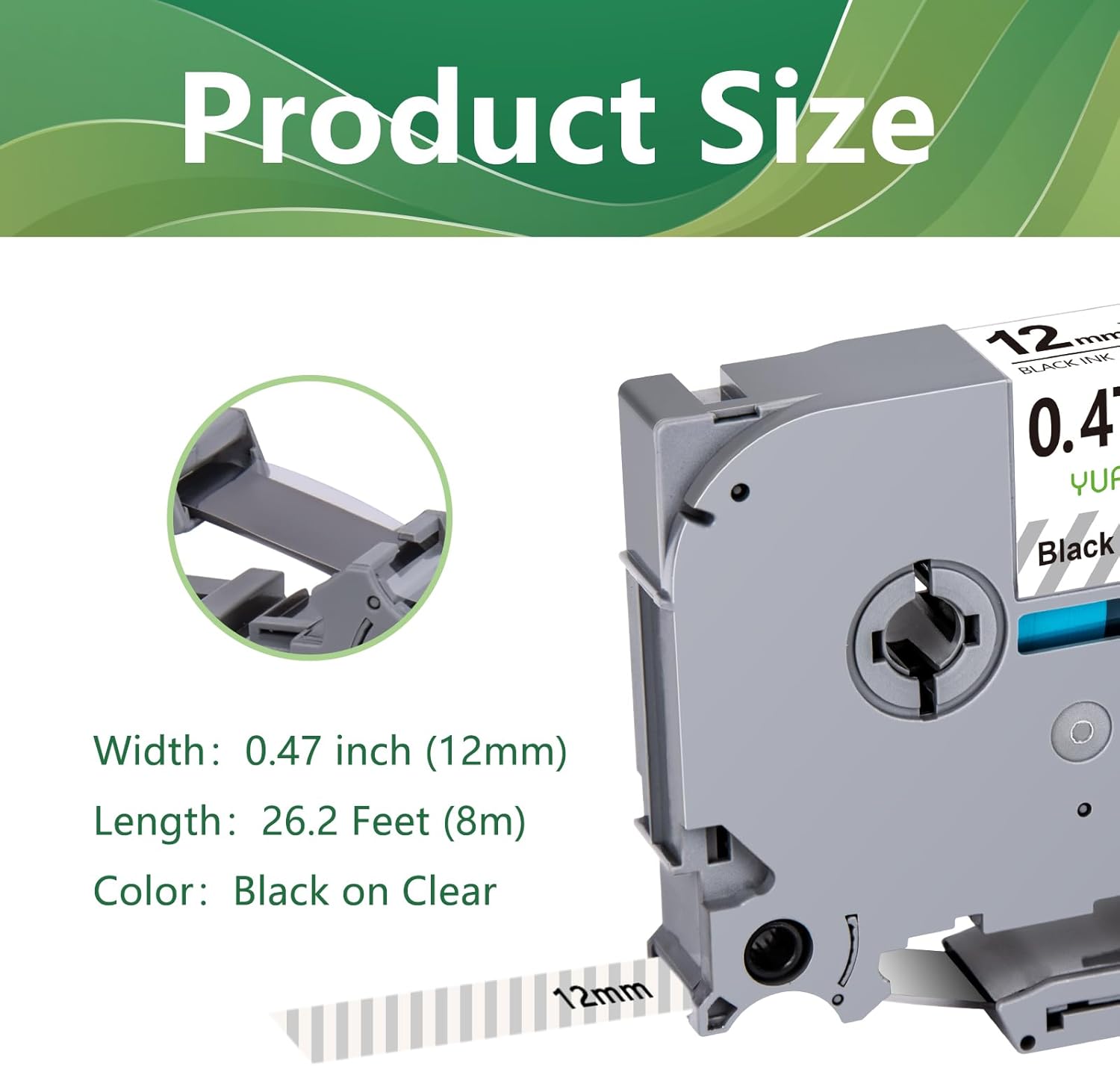 - Color: black letter on clear tape, Width: 1/2 inch (12mm 0.47), Length: 26.2 feet (8m) for each laminated label clear tape