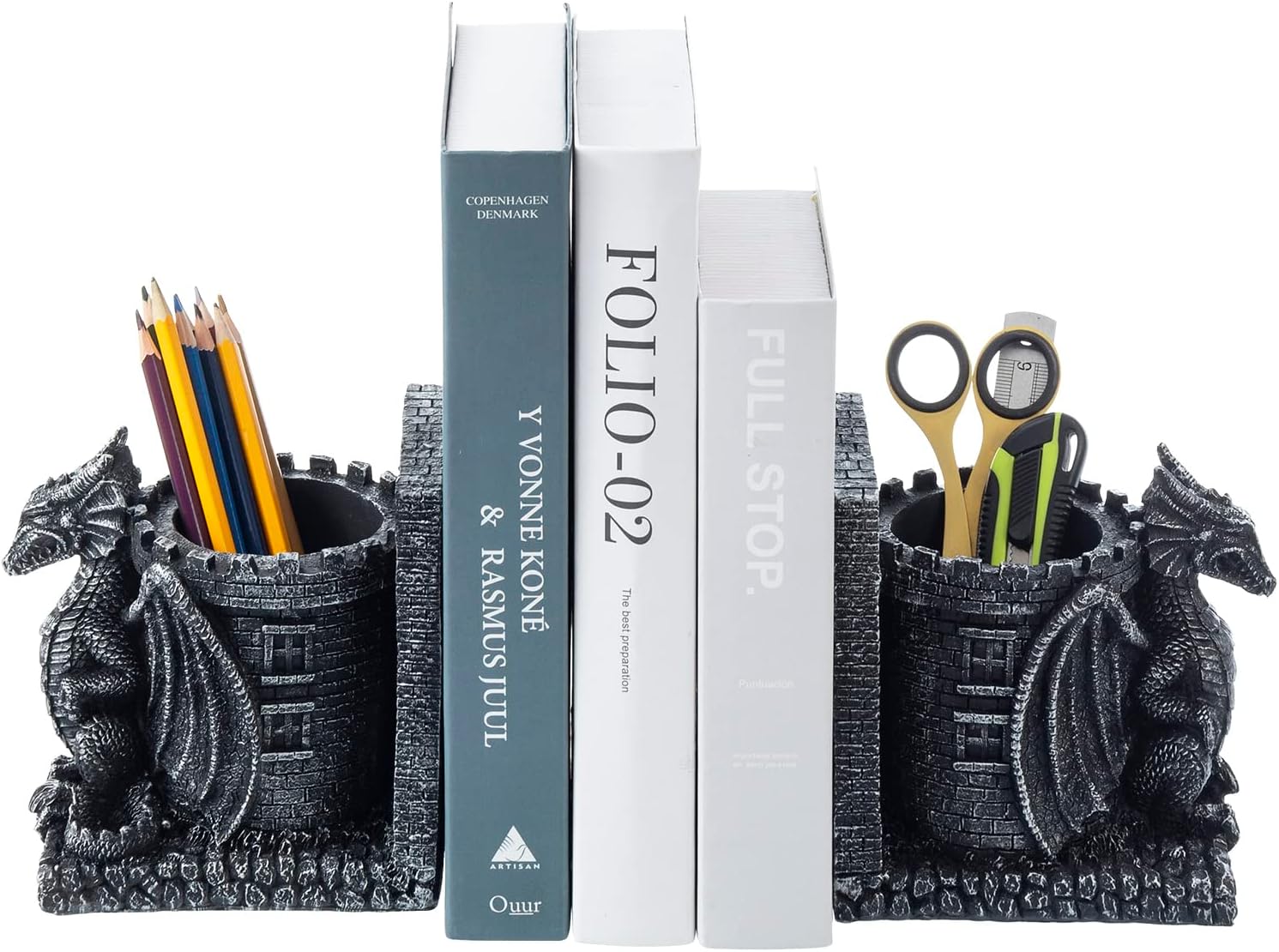 - A Unique Fantasy-Themed Gift: Whether a fan of medieval realms, gothic decor, or an enthusiast of magical and dark, mystical beasts, these book ends with pen holders are the ultimate present for readers of tales from the Middle Ages, safeguarding a collection of fantasy, magic, or adventure literature **Includes full bottom pad**