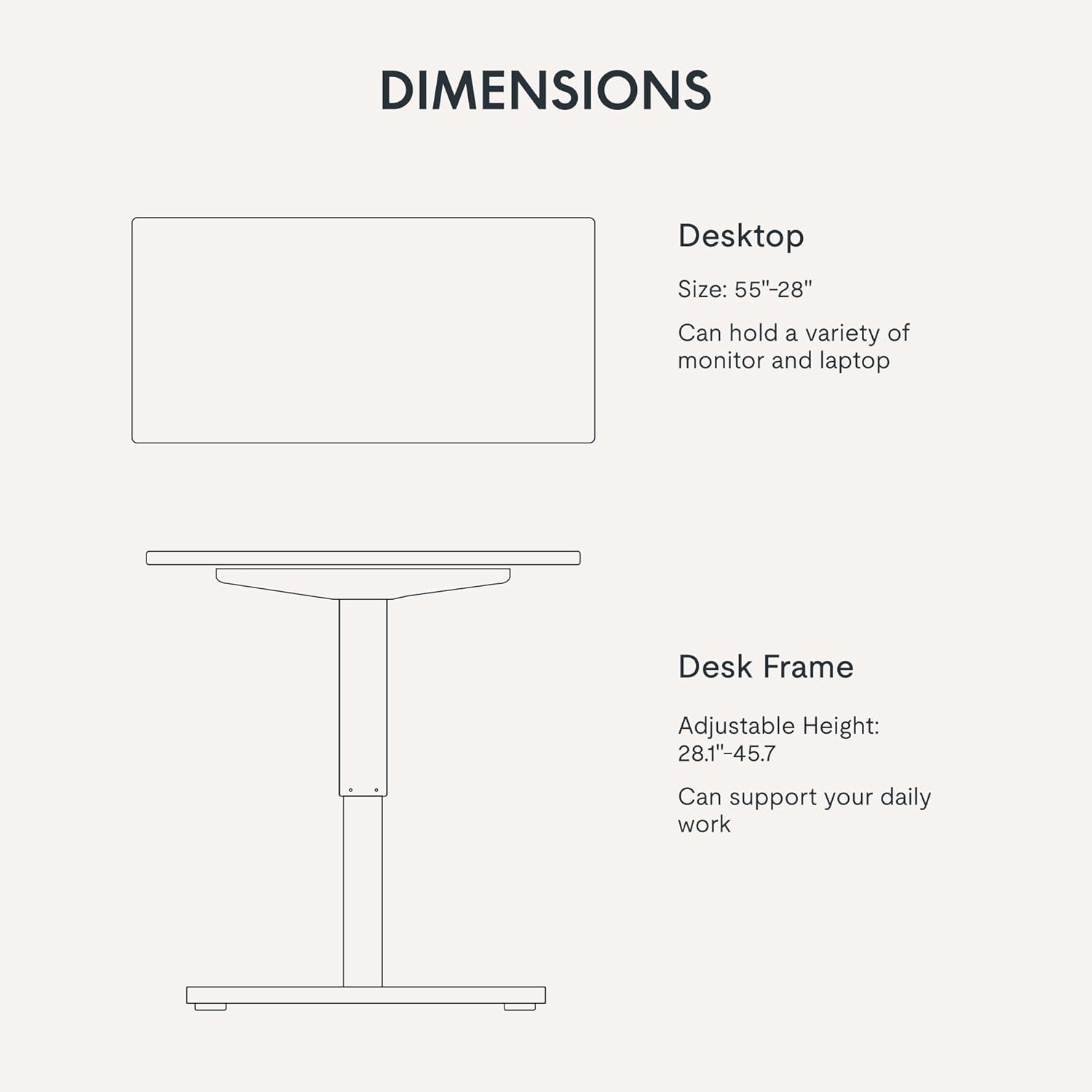 - SMOOTH ELECTRIC HEIGHT ADJUSTMENT: Say goodbye to manual height adjustments. This desk is equipped with an electric lift system that allows you to easily adjust the desk's height from 28.1" to 45.7"(without 1" thickness of table top included). Even better, the motor operates quietly with noise levels below 50 dB, ensuring a peaceful working environment.
