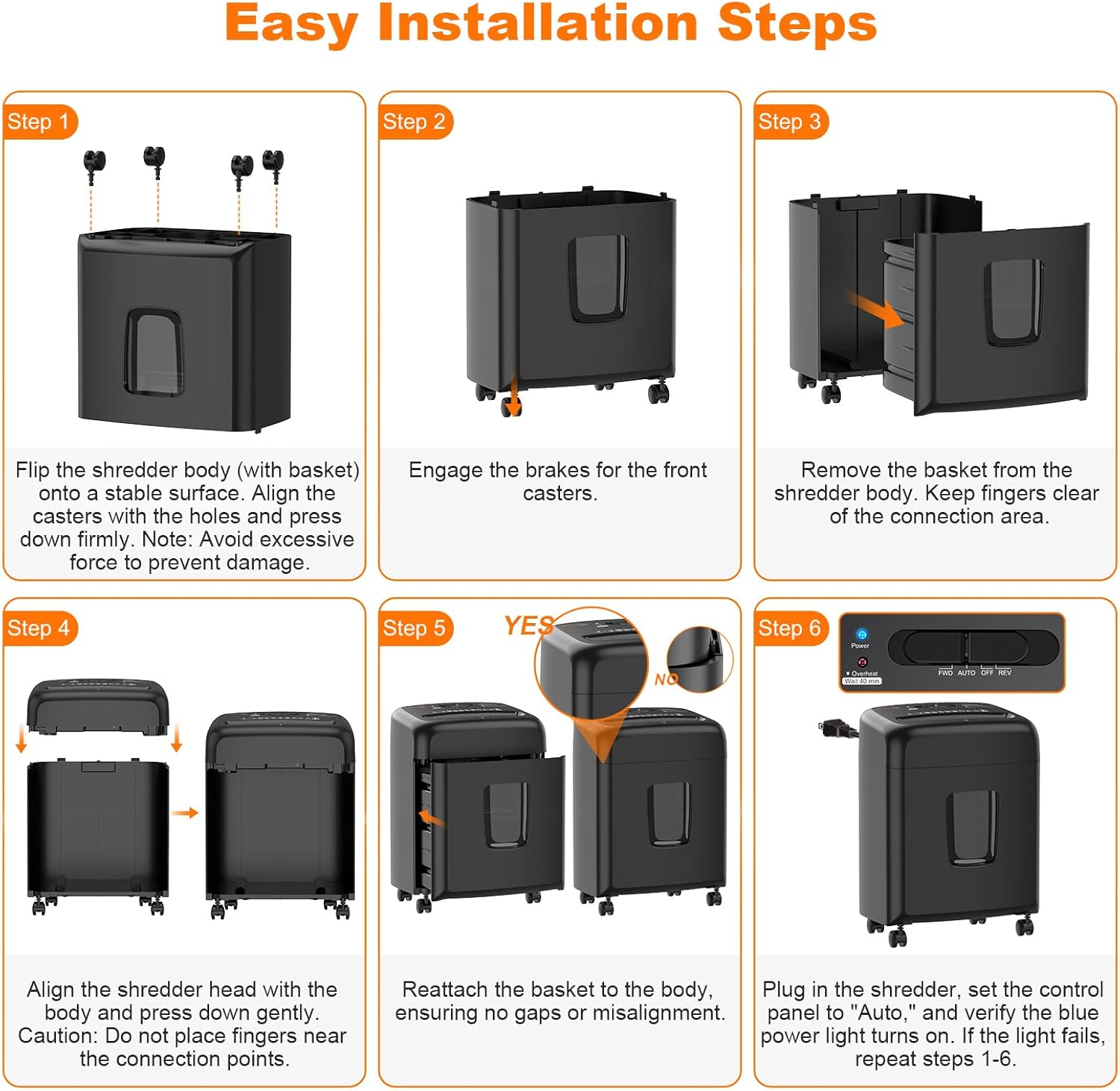 - Step 1: Flip the shredder body (with basket) onto a stable surface. Align the casters with the holes and press down firmly. Note: Avoid excessive force to prevent damage Step 2: Engage the brakes for the front casters Step 3: Remove the basket from the shredder body; Keep fingers clear of the connection area Step 4: Align the shredder head with the body and press down gently; Caution: Do not place fingers near the connection points Step 5: Reattach the basket to the body, ensuring no gaps or misalignment Step 6: Plug in the shredder, set the control panel to "Auto," and verify the blue power light turns on; If the light fails, repeat steps 1–6