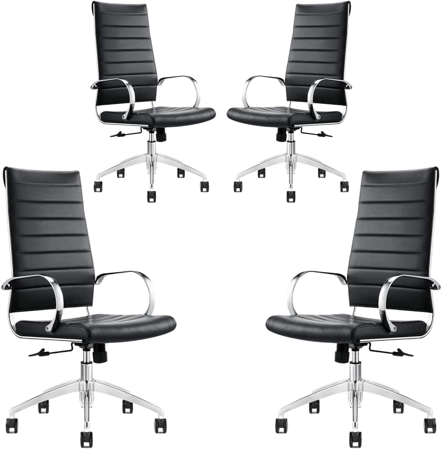 Ribbed High Back Conference Room Chairs- Lumbar Support, Modern Style Executive Chair for Home and Office - 360 Swivel Rolling Wheels - Aluminum Chrome Frame & Base - Black (Pack of 4)