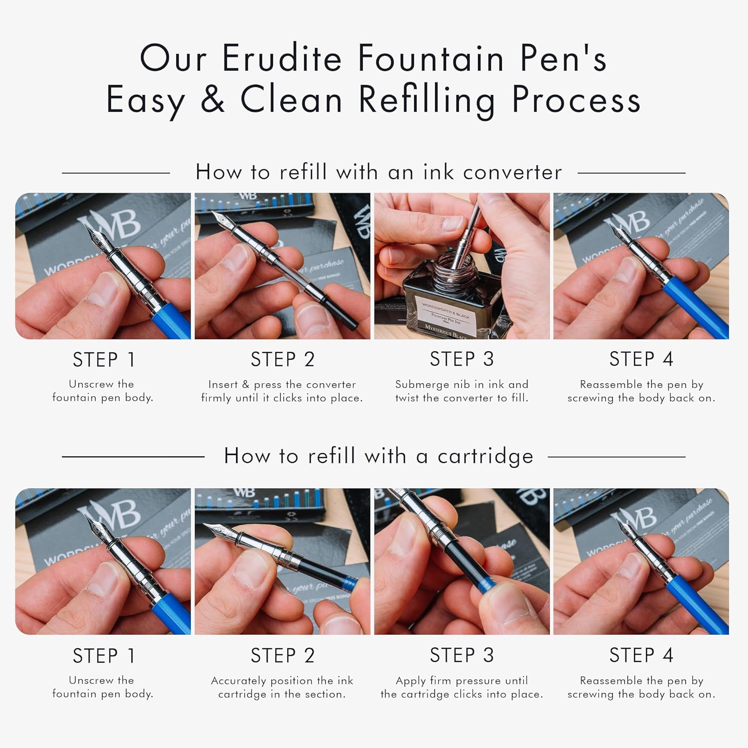 - ✒️Discover The All-inclusive Refillable Fountain Pen Set - Includes luxurious fountain pen, ink converter, 24 Pack Ink Cartridges, and a Gift Pouch - ready to be gifted. Each calligraphy ink and fountain pen ink cartridges comes in a plastic re-closable case and will last you at least 2 weeks of regular use. With every order is a complete instruction booklet for your Wordsworth and Black Pen Set. All the information you'll need to get started using and enjoying your luxurious writing tool!