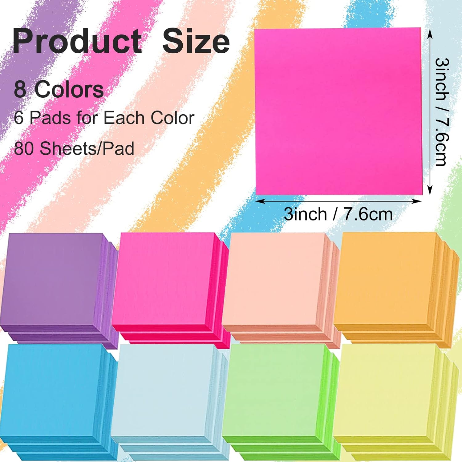 - PACKAGE INCLUDE: Comes with 48 packs pop up sticky notes 3x3 , 8 bright assorted color, each color for 6 packs, 80 sheets/pad, 3840 sheets in total, you'll have plenty of sticky notes to last you through the year