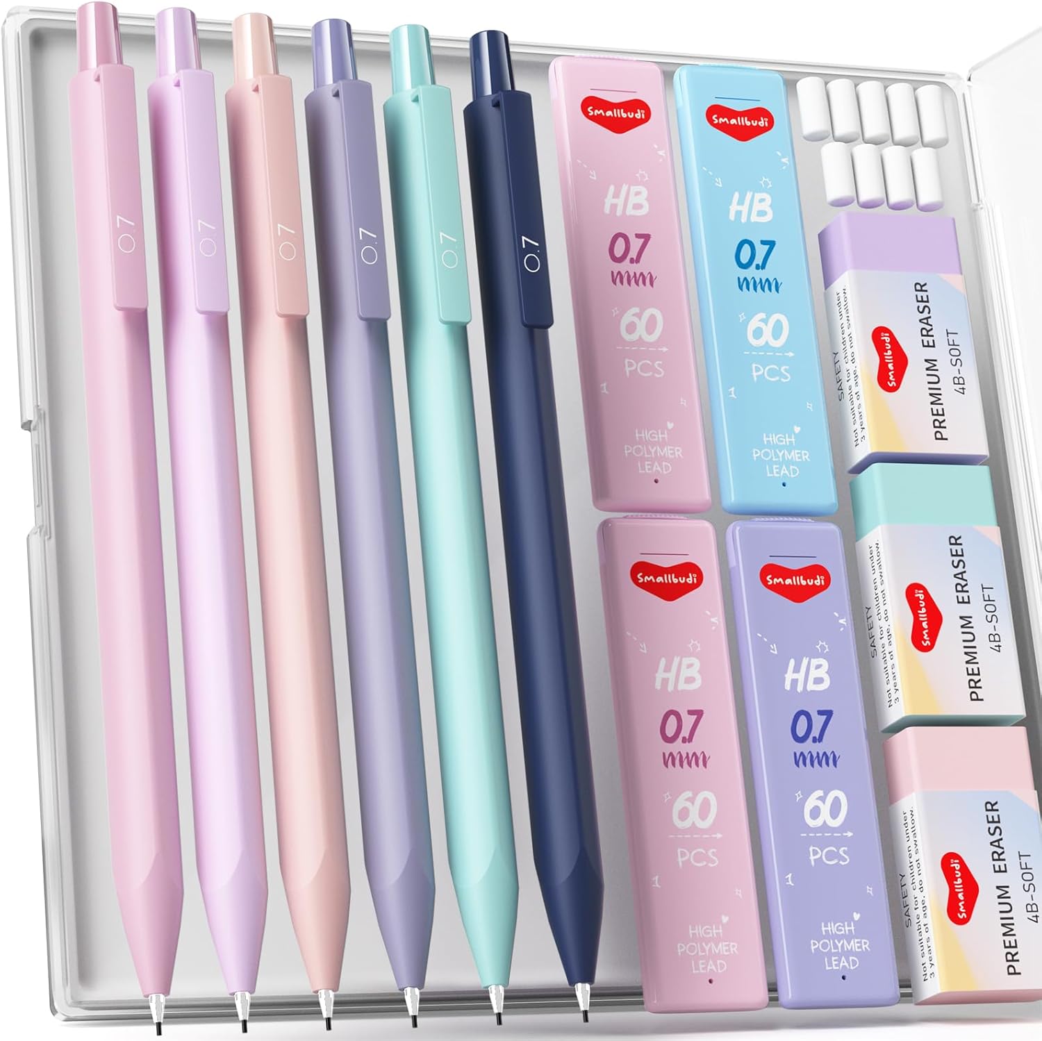 - Valued Mechanical Pencil Set - includes 6 colorful 0.7mm mechanical pencils (pink, navy, blue, violet, rose, purple), 4 tubes HB(#2) lead refills, 3 pastel erasers, 9 small eraser refills and 1 plastic storage case. The perfect school supplies set for students