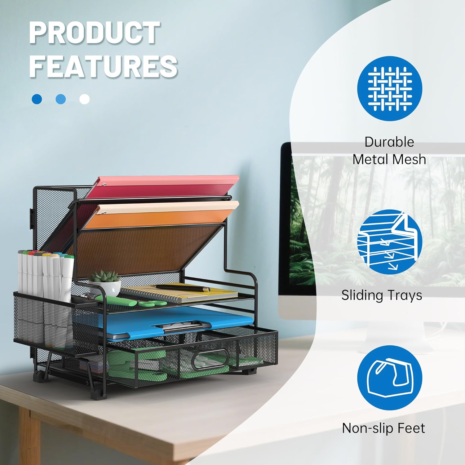 5 Tier Desk Organizer with Drawer & Pen Holders, Desk File Organizer Letter Tray Paper Organizer, Black