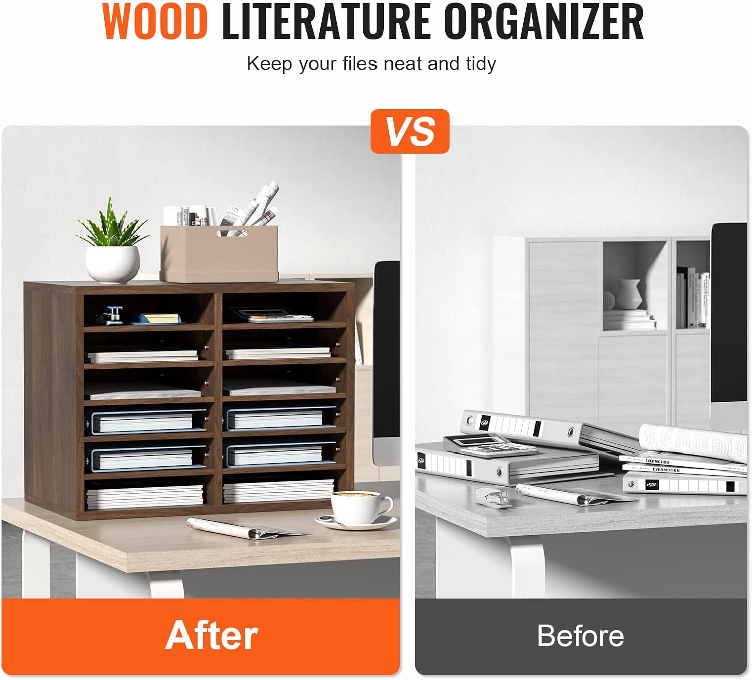 - Maximize Your Space: Say goodbye to cluttered desktops with VEVOR 20.4''x12''x16.1'' wood literature organizer. It has 12 compartments in total, arranged in 6 rows and 2 columns. You'll have ample space to store and organize books, documents, magazines, papers, and other materials. Keep your workspace neat and tidy with ease.