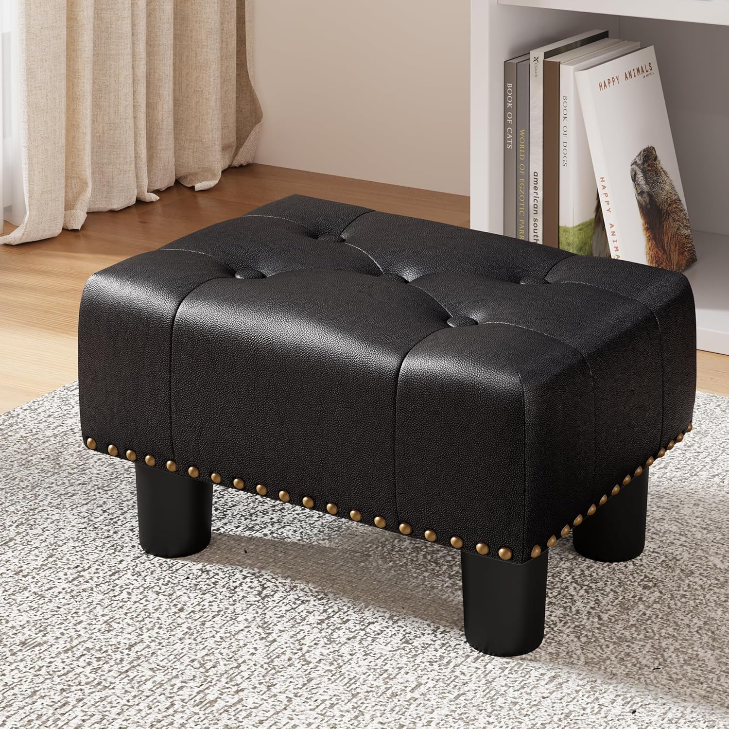 LUE BONA Small Tufted Foot Stool, Black Rivet Faux Leather Footrest with Plastic Legs, 9''H, Rectangle Foot Stools for Adult with Non-Slip Pads, Sofa Footstool for Living Room, Couch