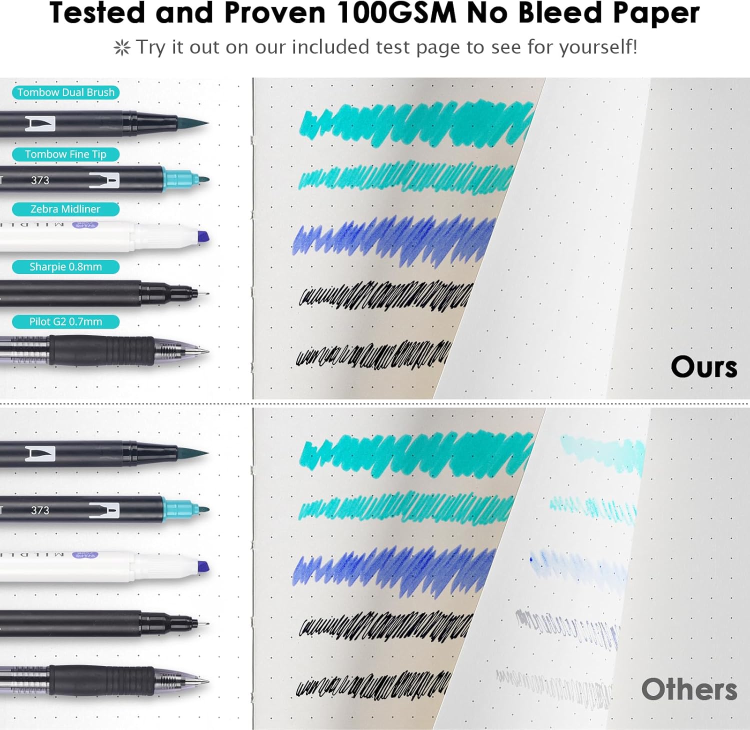 - 【Thick Paper for Writing Without Limits】Large A5 hardcover notebook (5.75"x 8.38"/146mm x 213mm), total 320 pages, includes 312 numbered pages(156 sheets). Each page includes 1107 dots with 5mm spacing: X27*Y41. Our INNOVATIVE PAPER TECHNOLOGY on 100GSM thick paper ensures a perfect canvas for your ideas - no bleed, no ghosting, as confirmed by tests with various pens commonly used in bullet journaling.