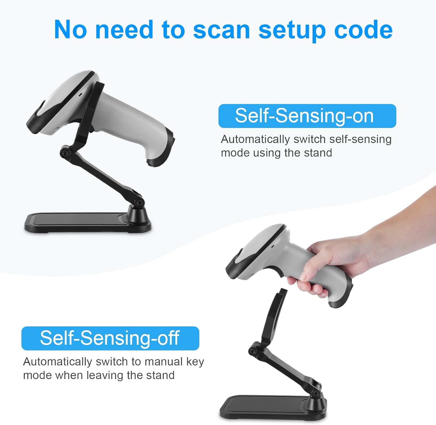 - 【Adjustable Stand】The wireless barcode scanner with stand, we can freely to adjust the best scanning angle as need. What's more continuous scanning mode sensor, we can easily realize handsfree scannning, no need to hold the wireless barcode scanner, release our hands