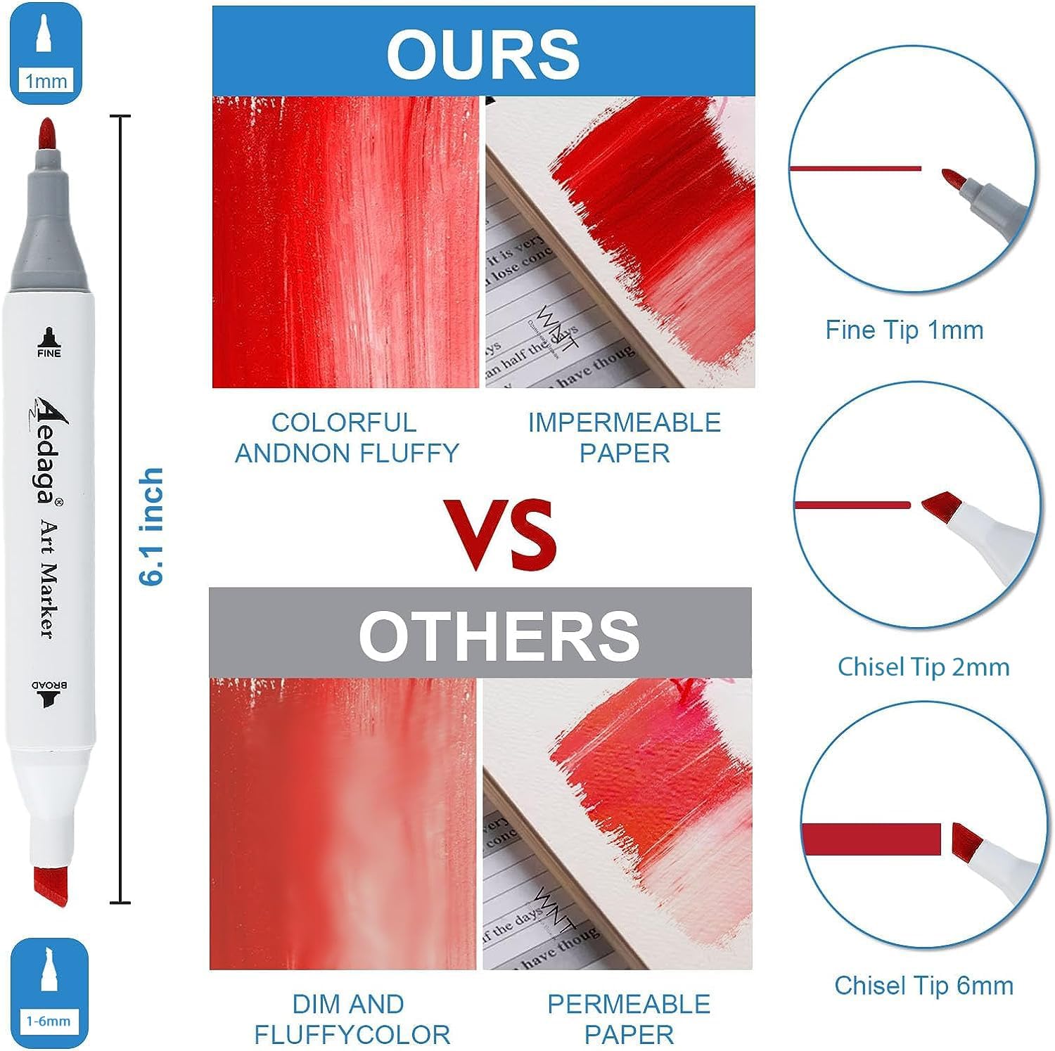 - QUICK DRYING AND DURABLE: Our alcohol-based markers use alcohol as the solvent, which dries quickly. The chisel tip of the dual marker is 6mm and the fine tip is 1mm.The drawing markers tip material is strong and durable.These alcohol markers for coloring have good ink that is colorful, non-fluffy, and can be used on non-permeable paper