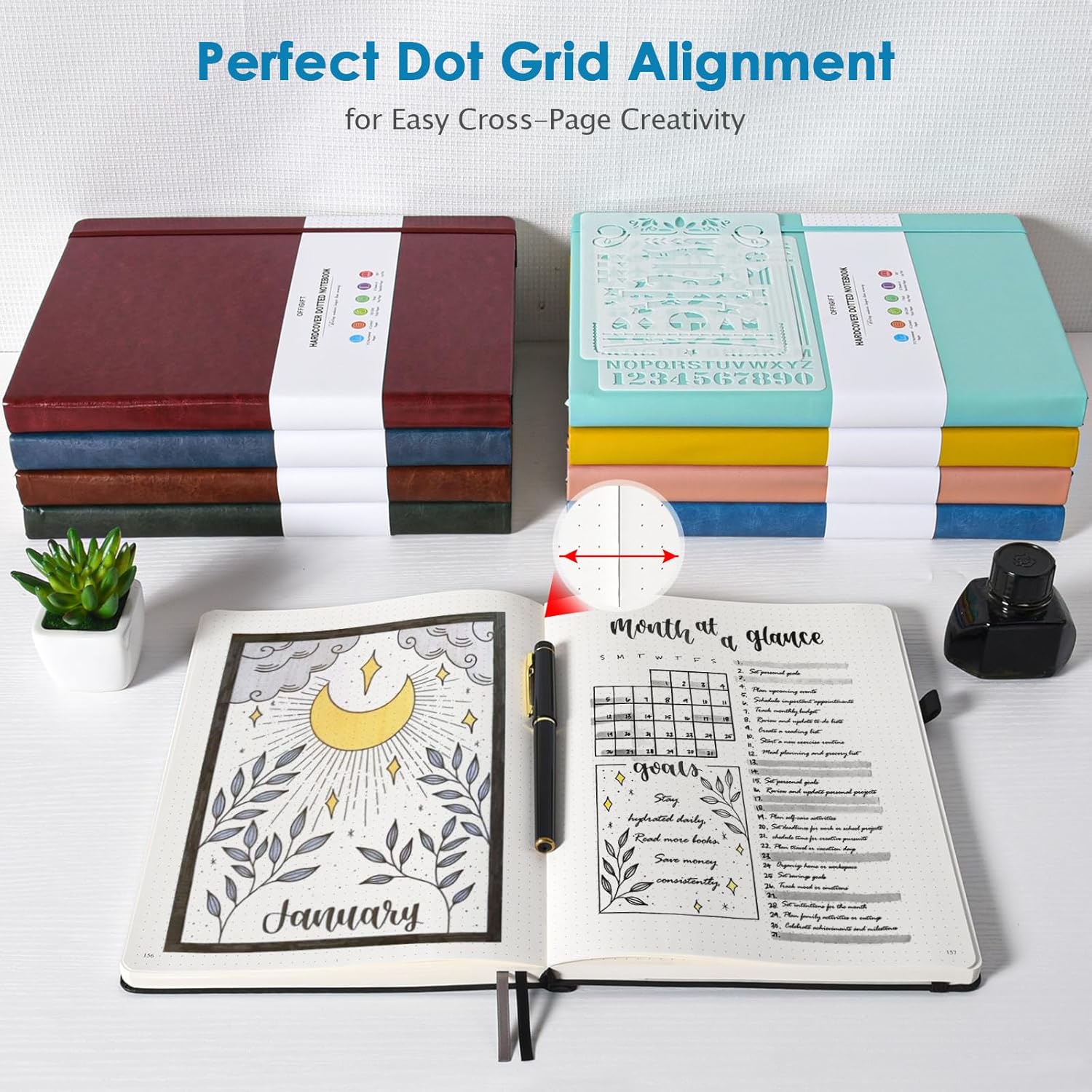 - 【User-Centered Design】❶ Add 2 subtle markers on the pages to assist with QUICK PAGE LAYOUT, allowing you to easily locate the center of rows and columns without counting every time; ❷ Include all the essential features of a perfect dot grid journal, such as 8 perforated sheets, 2 bookmarks, elastic closure band, pen holder, and back pocket; ❸ BONUS - 2 stencils are being gifted to you to create your ideal bullet point journal.