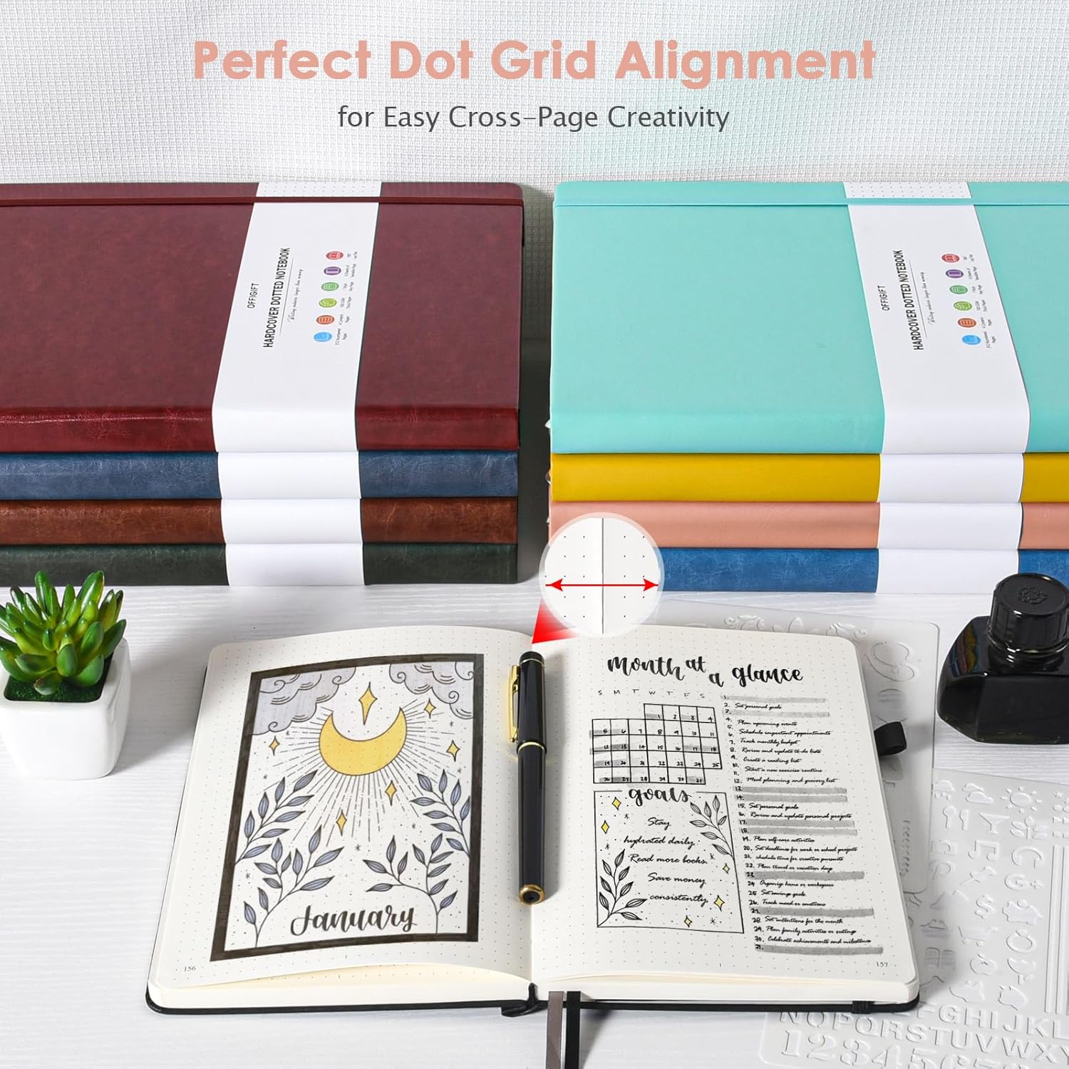 - 【User-Centered Design】❶ Add 2 subtle markers on the pages to assist with QUICK PAGE LAYOUT, allowing you to easily locate the center of rows and columns without counting every time; ❷ Include all the essential features of a perfect dot grid journal, such as 8 perforated sheets, 2 bookmarks, elastic closure band, pen holder, and back pocket; ❸ BONUS - 2 stencils are being gifted to you to create your ideal bullet point journal.