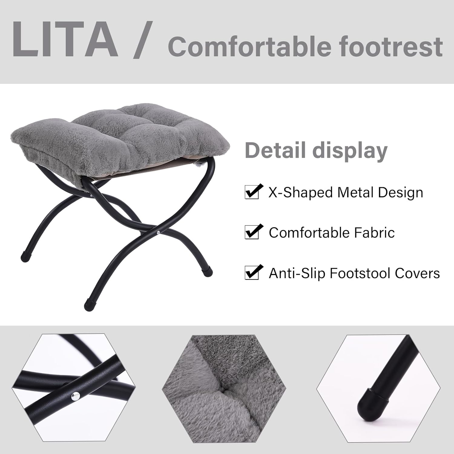 LITA Folding Upholstered Footrest Stool, Modern Small Portable Accent Ottoman with Detachable Thick Cotton Cushion Padded Sofa Stool with Metal Frame for Lazy Chair, Living Room & Bedroom, Plush Grey